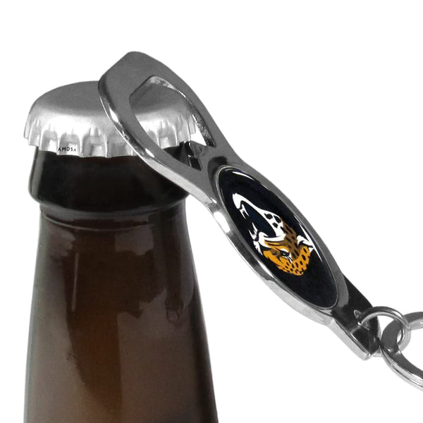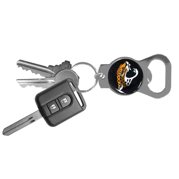 Our NFL bottle opener key chain has a polished chrome finish and features the school logo.
