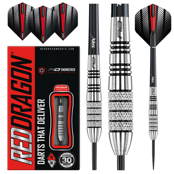 Set of 3 x 30g - 80% premium quality Red Dragon tungsten darts; Red Dragon black nylon ring grip shafts & 2 sets of Red Dragon standard flights; If you want to up the ante on your game, then this is the dart that can raise your score in a heartbeat;