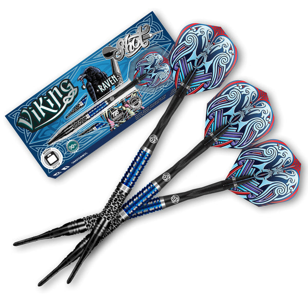 The epic Shot Viking saga rumbles on with the sleek and swift Raven dart barrel. A powerful Viking war symbol, Ravens were the combat reconnaissance agents of Odin himself - with the agility to attack potential predators in flight. This collectible barrel is emblazoned with the Shot siege grip? interlocking shields and a new Talon grip - with axial milling for positive placement - large and in charge for those who throw from the rear. Gleaming in a jet-black titanium coating with a subtle flash of midnight blue, like an outstretched raven? wing, finished with a glossy hand-drawn flight. Whip out your Raven 90% Tungsten steel tip darts - and put your adversaries on notice. You might see a Viking Raven flying from the hand of Russian darts star Boris Koltsov (aka The Russian Viking) -Shots Moscow-based player with huge heart and massive potential.