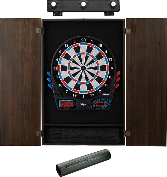 Give your game room the perfect centerpiece with the Viper 777 Electronic Dartboard, Metropolitan Espresso Cabinet, Dart Mat & Shadow Buster Dartboard Light Bundle! This bundle fits well with any d?or and has everything you need to take your game to the next level. The 777 Dartboard is standard 15. 5regulation size and, with 43 games and over 320 scoring methods programmed into it, offers up to 8 players near-endless options for beating their rivals and showing off their skills. It also features a backlit LCD scoreboard with cricket displays to keep your scores safe from human error. All of the boards features are easily navigable via a simple ten-key interface. The segments of the 777 are made from thermal resin and feature concave segment holes to catch your shots and reduce damage to the material. An ultra-thin spider helps minimize bounce-outs, and a catch ring surrounding the board shields your wall from stray throws. Meanwhile, the Metropolitan Cabinet is constructed from pine and held together via box joints; its back is reinforced with thick black cloth to protect your wall from punctures. The doors of the cabinet are fitted with self-closing brushed nickel hinges. Darts and other accessories can be stored in the compartment below the board area. The Shadow Buster illuminates your dartboard from above, making it - and all of your targets - visible in any rec room at any time. It also flips up when not in use and runs on four AA batteries. Finally, the dart mat handily rolls out onto your floor without the aid of adhesives to protect it from bounce-outs, and features a throw line embossed directly onto the vinyl.