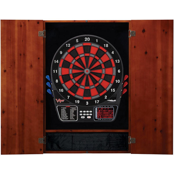 Everything you need to optimize your darting experience is now available in a convenient, comprehensive bundle. Choose either just the premium dartboard cabinet or a bundled set which contains the same dartboard cabinet and an electronic dartboard. Each cabinet includes mounting hardware. The Viper Metropolitan dartboard cabinet features a black felt lining and is available in 4 wood finishes (cinnamon, espresso, mahogany and oak). Crafted with solid pine, box joints and bronze hinges, this cabinets quality construction provides lasting durability and complements the look of any room. Its fitted with 2 compact door stoppers which help protect the dartboard and cabinet from a door slamming shut. Open dimensions: 49.5'' L x 38.5'' W x 3.5'' D; closed dimensions: 24.75'' L x 38.5'' W x 3.25'' D. Each electronic dartboard features a regulation 15.5'' target face and an ultra-thin spider which greatly reduces bounce outs and allows for a closer grouping of darts to maximize scoring. All bundles (with the exception of just the cabinet only and the standard bundle) include 1 set of Viper Black Magic 18 gram soft tip darts. These darts are designed with black coated brass barrels that deliver exceptional balance and styling. Strategically placed knurling and grooves provide excellent gripping points, enhancing your control. Each dart features an aluminum shaft featuring locking holes which deliver a tight connection that improves stability. The Elite bundle includes a Viper laser throw/toe line marker. The bright and energy efficient lighting of the laser allows it to be seen even in intense daylight. The adjustable laser throw/toe line provides a modern alternative to traditional adhesive floor markers. Once the laser is mounted, simply tighten the 2 screws on either side to ensure it stays in place, even if it is bumped.