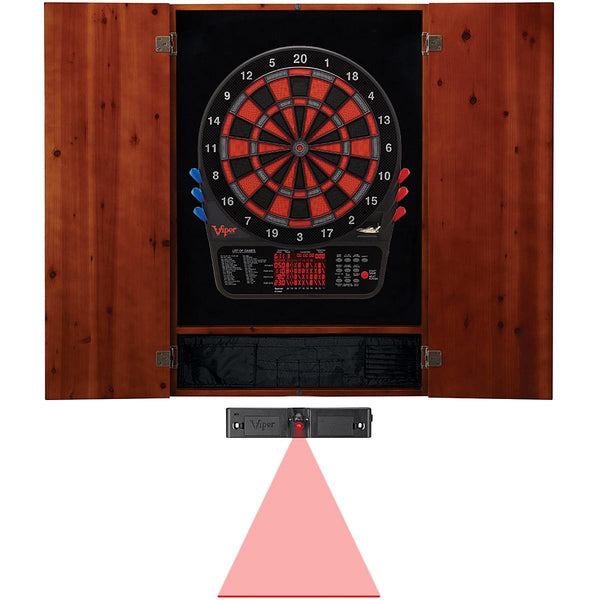 Everything you need to optimize your darting experience is now available in a convenient, comprehensive bundle. Choose either just the premium dartboard cabinet or a bundled set which contains the same dartboard cabinet and an electronic dartboard. Each cabinet includes mounting hardware. The Viper Metropolitan dartboard cabinet features a black felt lining and is available in 4 wood finishes (cinnamon, espresso, mahogany and oak). Crafted with solid pine, box joints and bronze hinges, this cabinets quality construction provides lasting durability and complements the look of any room. Its fitted with 2 compact door stoppers which help protect the dartboard and cabinet from a door slamming shut. Open dimensions: 49.5'' L x 38.5'' W x 3.5'' D; closed dimensions: 24.75'' L x 38.5'' W x 3.25'' D. Each electronic dartboard features a regulation 15.5'' target face and an ultra-thin spider which greatly reduces bounce outs and allows for a closer grouping of darts to maximize scoring. All bundles (with the exception of just the cabinet only and the standard bundle) include 1 set of Viper Black Magic 18 gram soft tip darts. These darts are designed with black coated brass barrels that deliver exceptional balance and styling. Strategically placed knurling and grooves provide excellent gripping points, enhancing your control. Each dart features an aluminum shaft featuring locking holes which deliver a tight connection that improves stability. The Elite bundle includes a Viper laser throw/toe line marker. The bright and energy efficient lighting of the laser allows it to be seen even in intense daylight. The adjustable laser throw/toe line provides a modern alternative to traditional adhesive floor markers. Once the laser is mounted, simply tighten the 2 screws on either side to ensure it stays in place, even if it is bumped.
