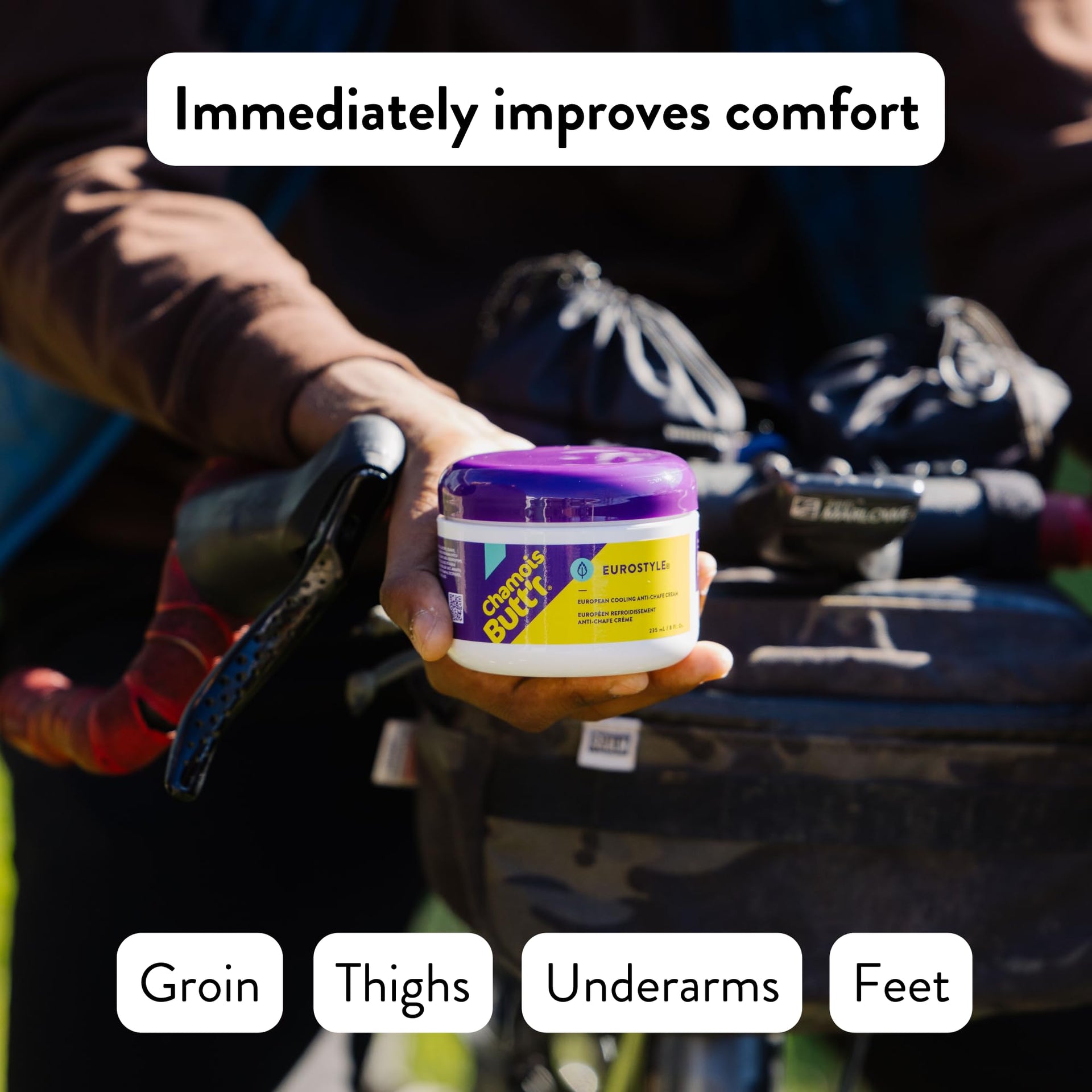 Chamois Butt'r Eurostyle is a non-greasy skin lubricant for cyclists. It is a superior athletic skin lubricant like the original formula Chamois Butt'r, but has the added skin conditioning benefits of menthol and witch hazel. It is valued by elite cyclists for these added benefits and ingredients. It can be applied to either the skin or the cycling shorts pad prior to riding to prevent chafing and skin irritation. It improves riding comfort immediately by lubricating the skin and preventing chafing. Chamois Butt'r makes cycling much more enjoyable. Chamois Butt'r is a water soluble athletic skin lubricant that washes off skin and clothes with soap and water.