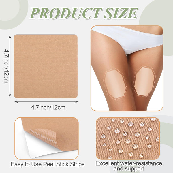 Features: Whether you're a gym enthusiast, a runner, a dancer or just someone with an active lifestyle, our thigh lift tape is a must-have accessory. It keeps your thighs protected, preventing friction that could disrupt your activities. Its mere presence shields your thighs against unwanted friction, enhancing your comfort during movement. Beyond its functional role as a thigh lift tape, we've carefully designed our product to offer maximum comfort. The soft cotton and nylon material feels gentle against your skin, ensuring that protection to your thighs never comes at the expense of your comfort. Specifications: Material: cotton and nylon Size: thigh lift tape is about 12 x 12cm/4.72 inch x 4.72 inch Package includes: 50 x Thigh lift tape Notes: Manual measurement, please allow slight errors on size. The color may exist a slight difference due to different screen displays.