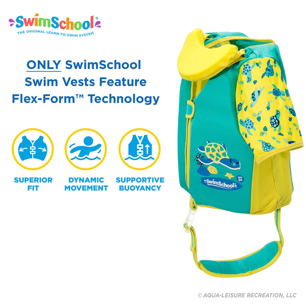 The Swim Trainer Swim Vest provides supportive buoyancy and balanced flotation that tilts kids forward in the swim position allowing them to safely practice swimming and explore the water.