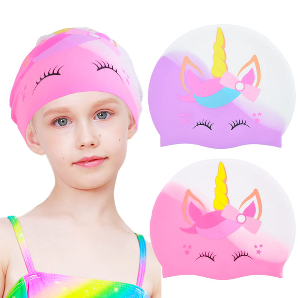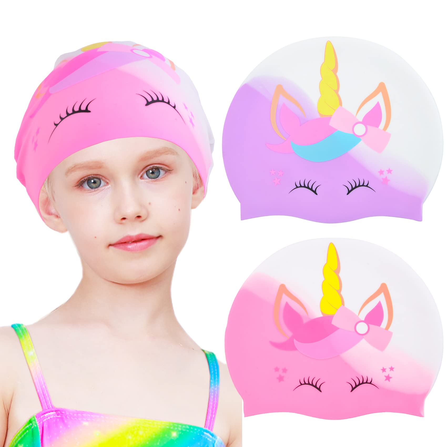 Kids Swim caps for Kids (Age 3-12 ), children, Boys and girls, Baby Waterproof Bathing caps for Long and Short Hair Application: These swimming hats can be widely applied for swimming pools, ocean, bathrooms and so on The delicate and cute swim cap designs double as a safety feature too, which allow you to easily spot your kids while theyAre playing in a crowded pool or ocean cozy to wear: These cute swim caps with appropriate thickness make your kids wear comfortably, nice elasticity and quality material make their head snugly, giving a sense of comfort to the head and enjoy good swim time Features: Waterproof, cover Ears, Protect hair, Anti-slip Unique Design, cute pattern with lovely colors comfortable Wearing Experience Specifications: Material: silicone Head circumference: about 45-55cm Age: Fit for 2-6 years old Styles: Unicorn and Dinosaur Package include: 2 x Kids swim caps Note: Please allow a little error on the size due to manual measurement The size here is reference only, please check the size carefully before purchasing The colors may exist slight difference due to different screens