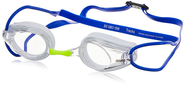 - Q: What color options are available for the Arena Tracks swim goggles? A: The goggles are available in a combination of white, clear, and blue.