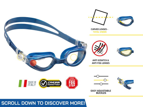 'Cressi Right goggles are perfect for all swim lovers. The Right are prestigious goggles with slightly curved lenses on the outer profile, to offer maximum visibility. The gasket is made with hypoallergenic, high-quality TPR to ensure comfort and a perfect seal. The double-strap is made of silicone to ensure a perfect fit without over-tightening. The Cressi-patented buckle system makes adjusting the strap effortless. Easy replacement of strap and buckle system. The lenses are anti-scratch resistant, 100% UV protection, and anti-fog treated. The Right are versatile goggles recommended for recreational swimming, as well as both indoor and outdoor use. The Right is designed and manufactured in Italy by Cressi, an Italian brand pioneer in swimming, scuba diving, and freediving equipment. ''