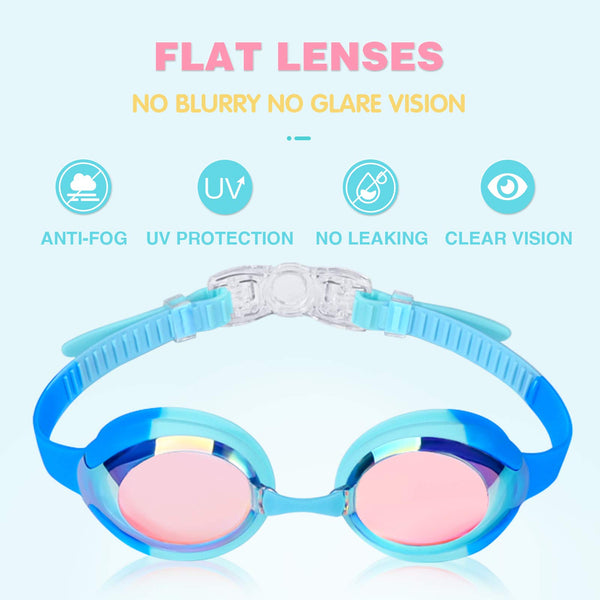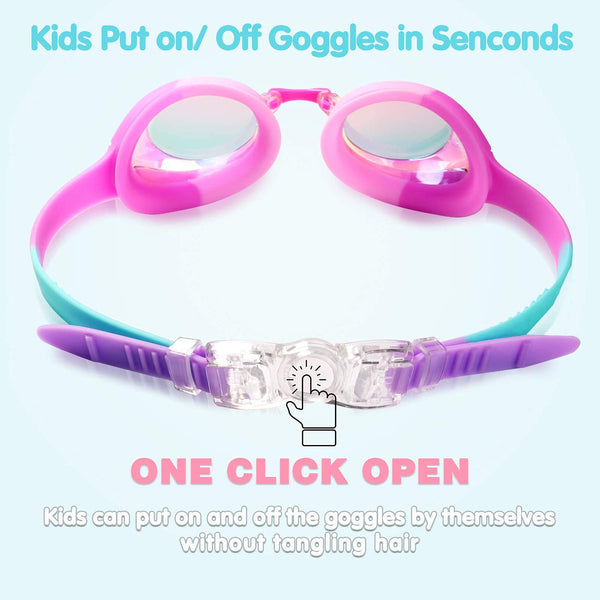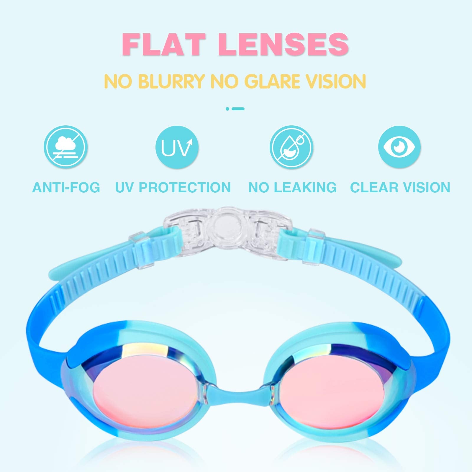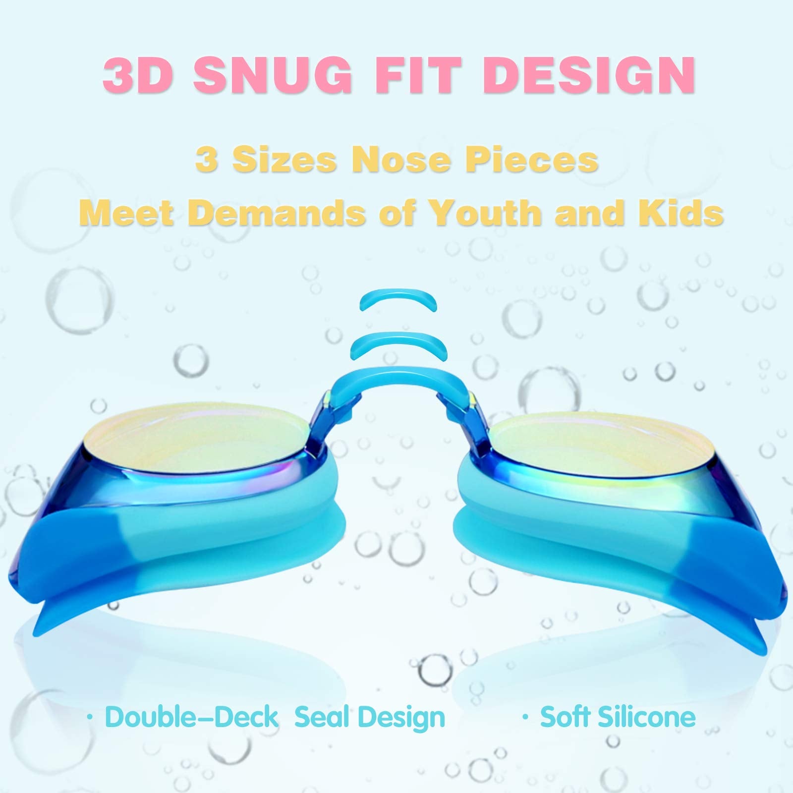 3 Interchangeable Nose Pieces & cOMFORTABLE FITcomes with 3 interchangeable curved nose pieces made of sturdy and unbreakable bendable ABS material that can meet different nose bridge heights and widths for toddlers, children and teens. Prevents leaving a red mark around the nose and hurting the nose. Flexible silicone frame allows the goggles to comfortably fit any face shape. AT LENSES & cRYSTAL cLEAR VISIONThe high transmittance Anti-Scratch lenses with 180-degree peripheral vision let kids & youth see clearly without blurring or distortion which grows more interest for children to explore the mysterious underwater world. Perfect swim glasses for swimming lessons. O LEAK SOFT SILIcONE Keary junior swim goggles are made from safe Latex-free and odorless soft silicone, which relieves pressure on the skin and also creates a double-seal to safeguard children from raccoon eyes, chlorine and bacteria. Soft memory silicone gasket and ergonomic design ensure a snug fit on different face shapes. Anti-Fog & UV ProtectionKeary goggles inner lenses are coated with the latest anti-fog treatment to let kids & youth see clearly underwater without blurring or distortion. The outer surface of the lens is coated with UVAUVB protection which can protect their eyes from pool water, sunshine and harmful bright lights. The impact-resistant Pc lenses keep children safe. Kids will love and trust these goggles. ONE BUTTON cLIcKSuper easy to adjust for kids & youth Keary gogglesA well-designed clasp makes it easy to put swimming goggles on and off with one press without tangling your hair. The upgraded button is more robust to prevent breakage and the anti-slip strap ensures the goggles remain in place during swimming.