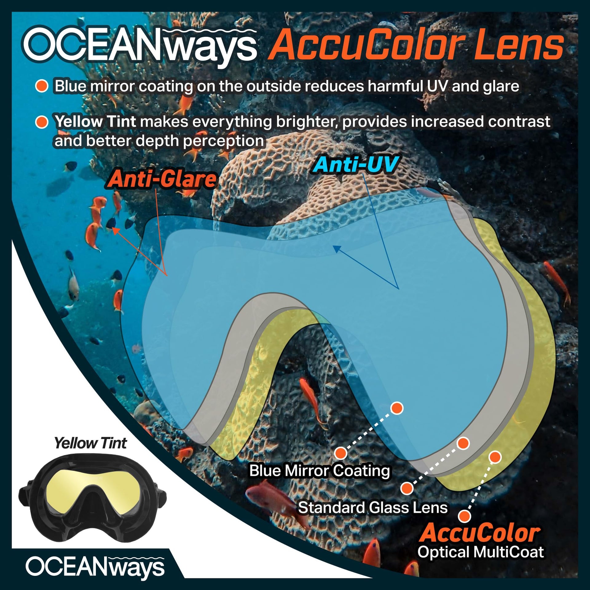 Explore the underwater world with precision and vividness, courtesy of our Oceanways SuperView AccuColor Masks. The AccuColor technology, available in two variants, provides distinct advantages. The version with a yellow inner tint enhances visibility in lower light conditions, making early mornings and late afternoons a vibrant spectacle. On the other hand, the rose-tinted model brings out the rich warmth of reef colors, from reds to oranges and yellows, by filtering out unwanted blue light. Both options are equipped with a protective blue mirror coating on the outside, safeguarding your eyes from UV rays and minimizing glare.