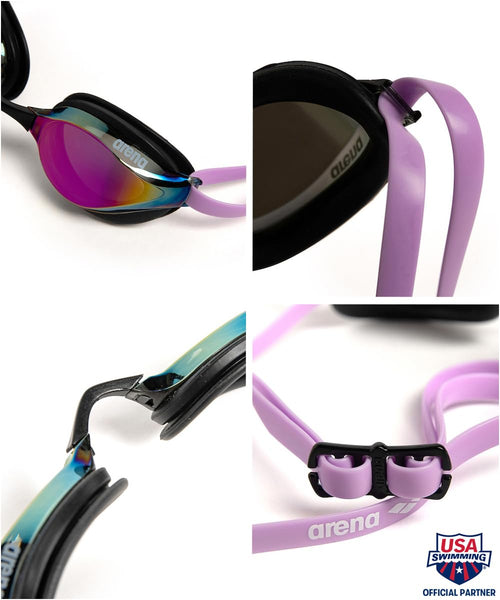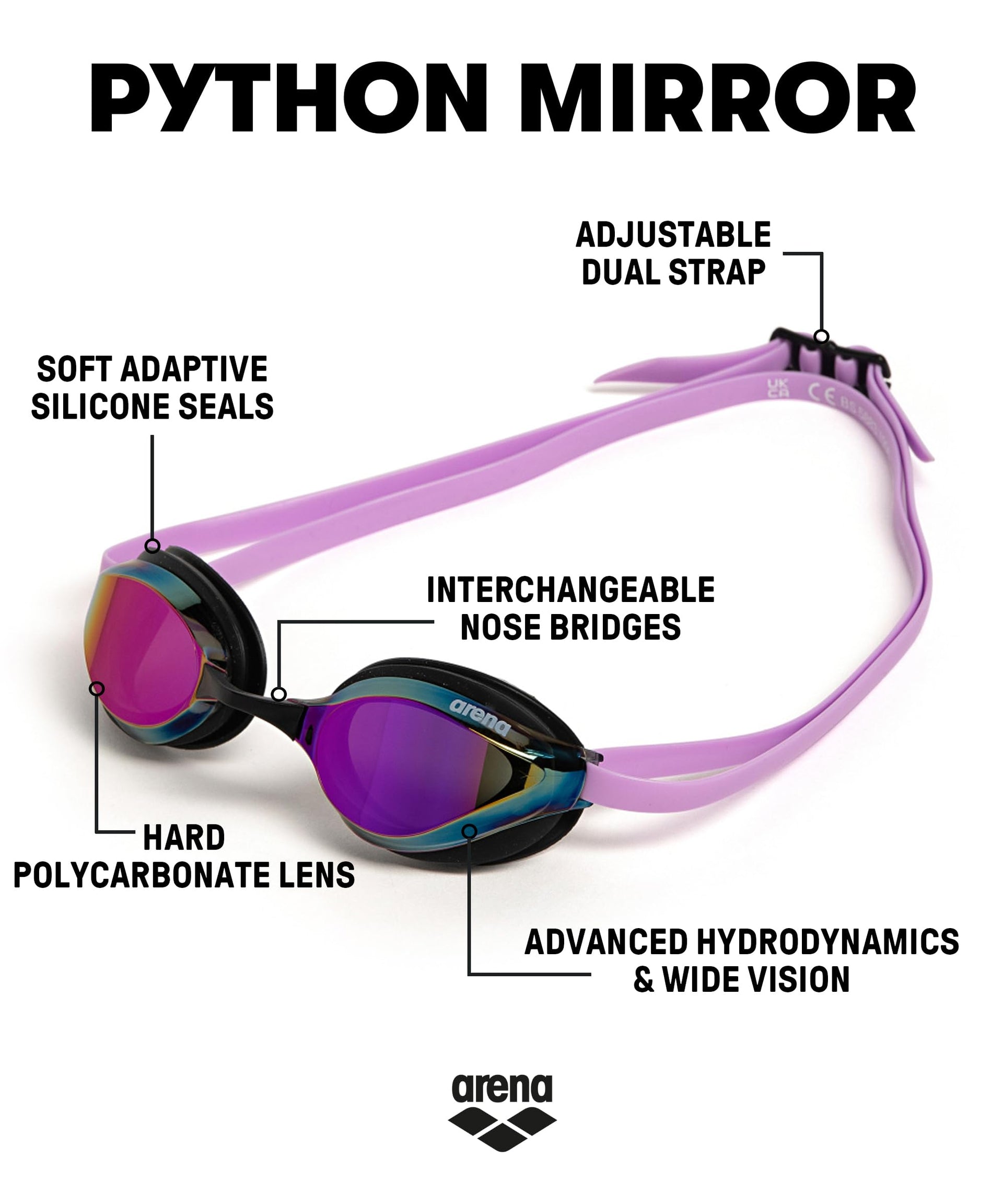 Arena Unisex Adults Python Racing Swim Goggles For Men And Women Anti-Fog Mirror Lens Max Comfort Dual Strap, Violet/Black/Viole