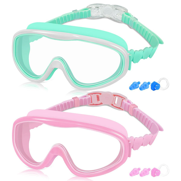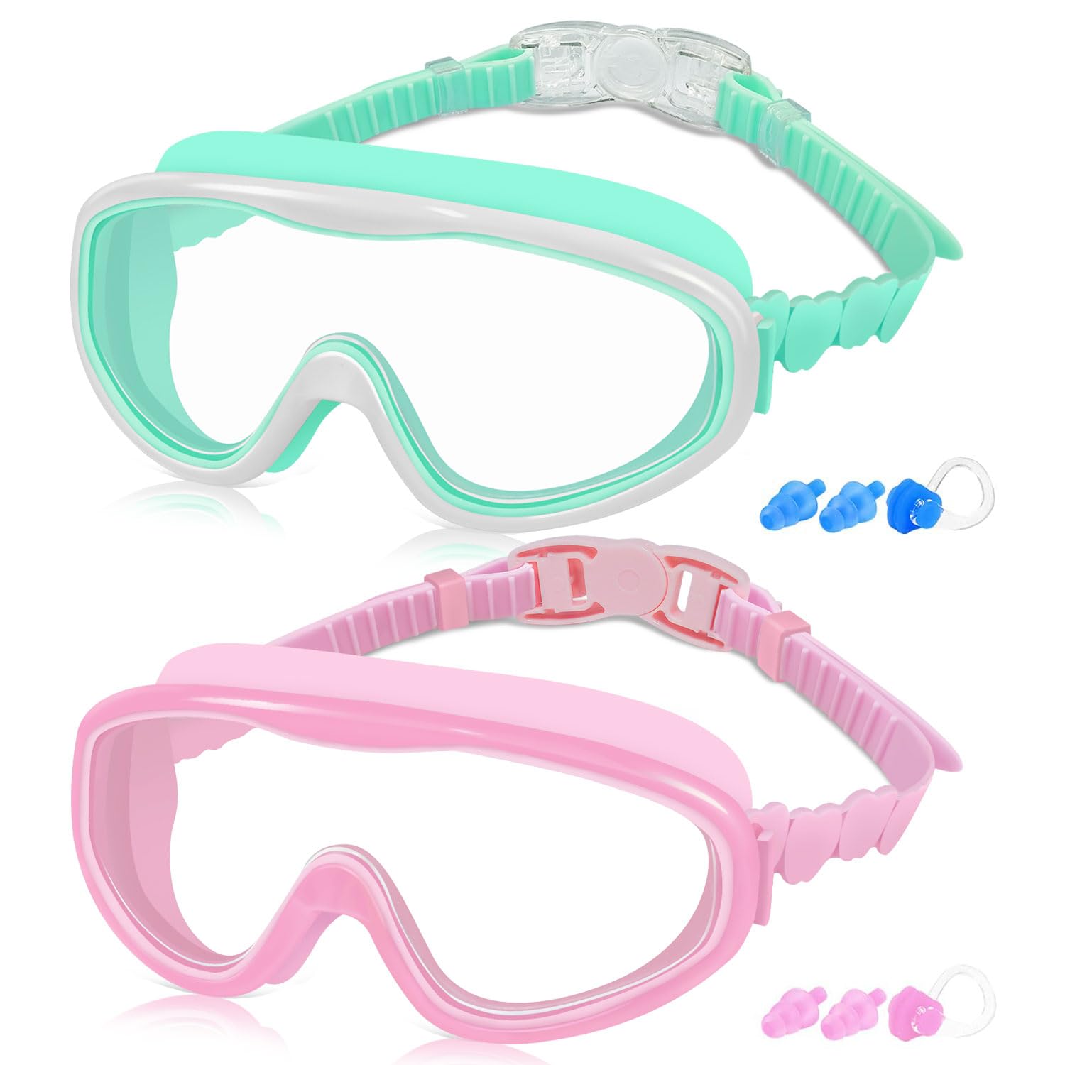 COOLOO Kids Swim Goggles for Age 3-15, 2 Pack Kids Goggles for Swimming with Nose Cover, No Leaking, Anti-Fog, Waterproof, Mint green+Pink
