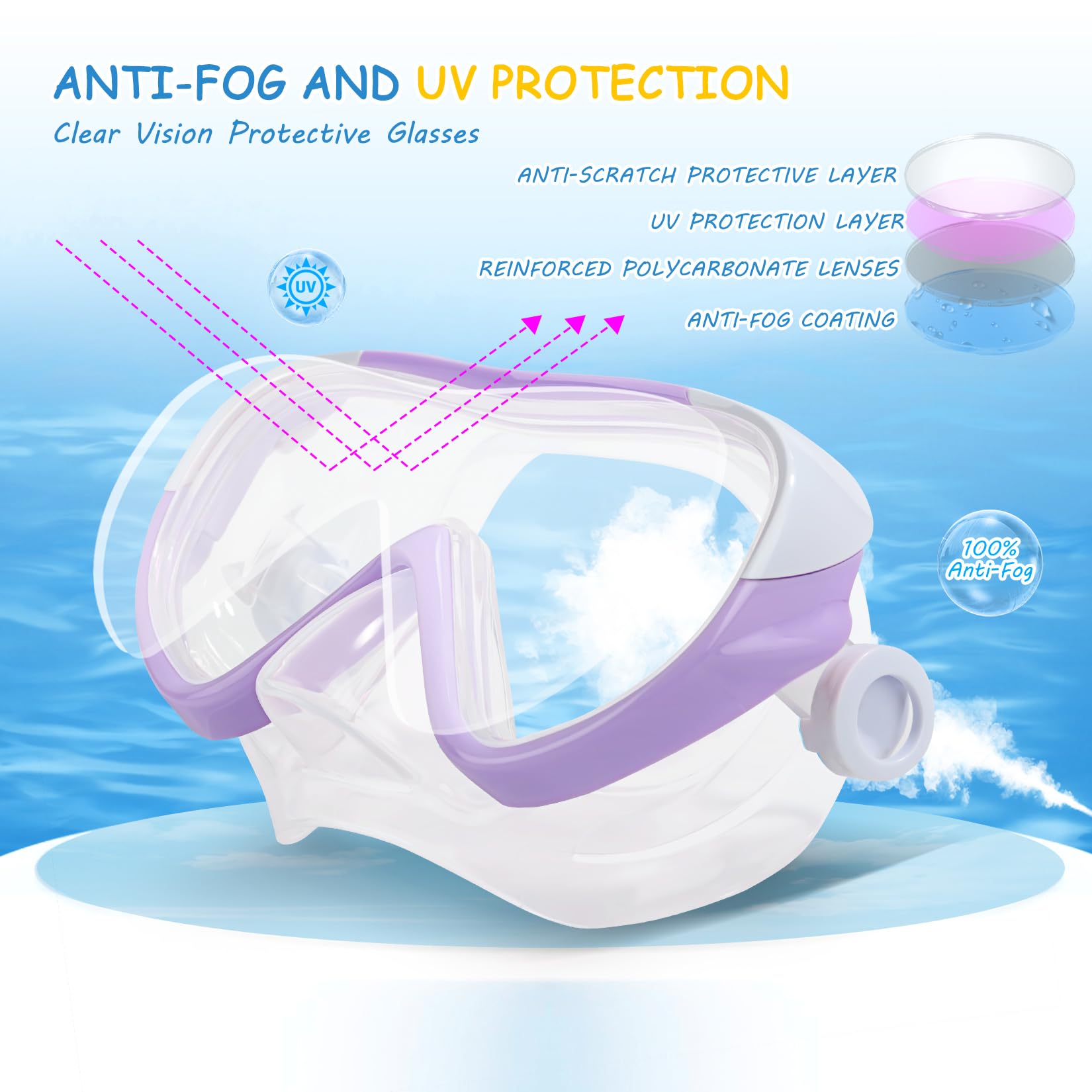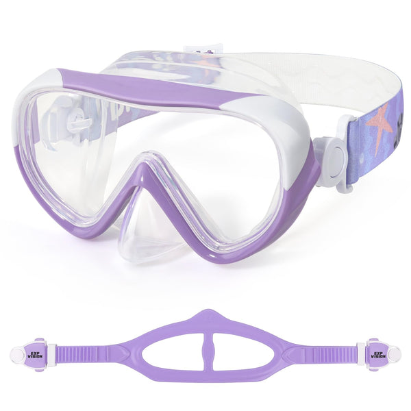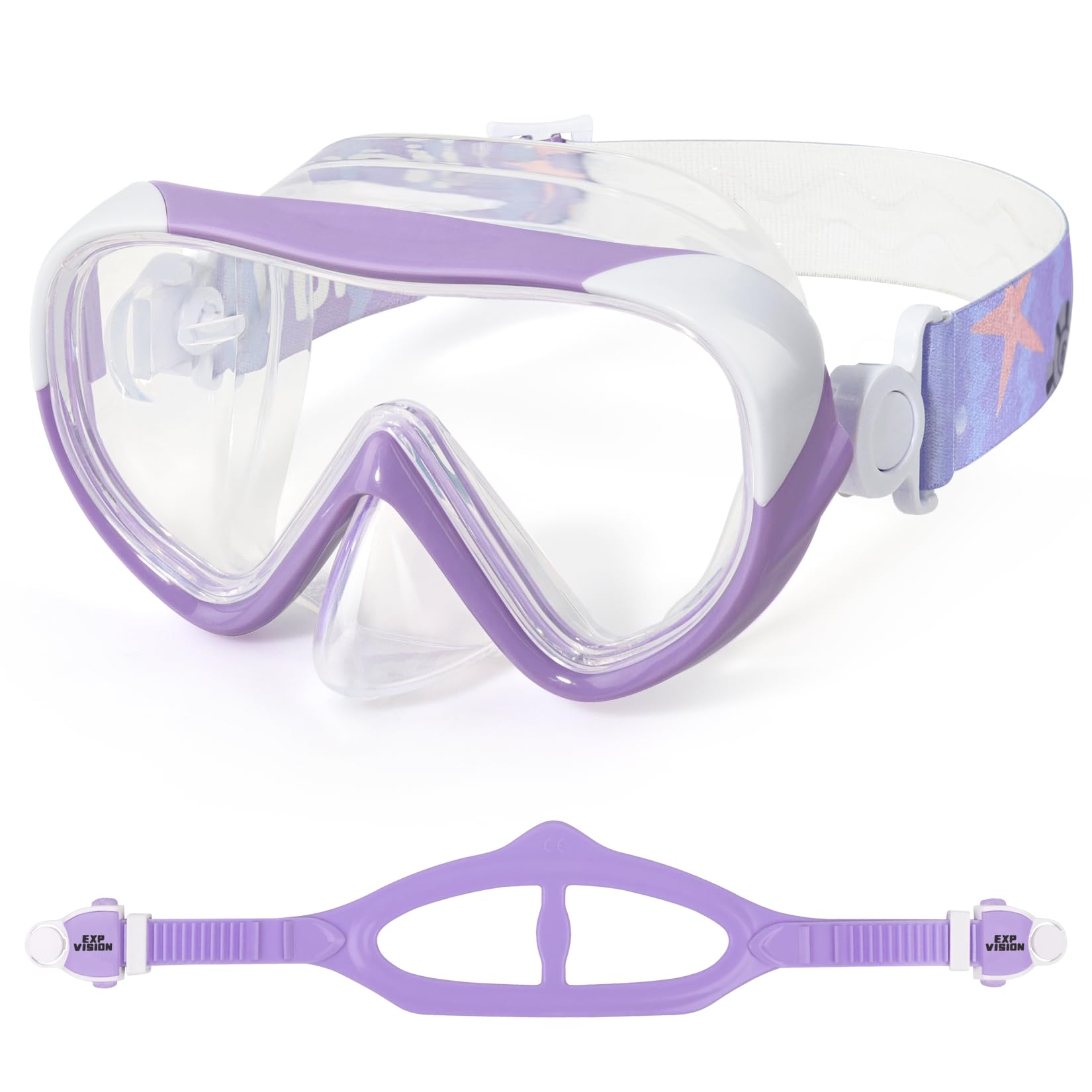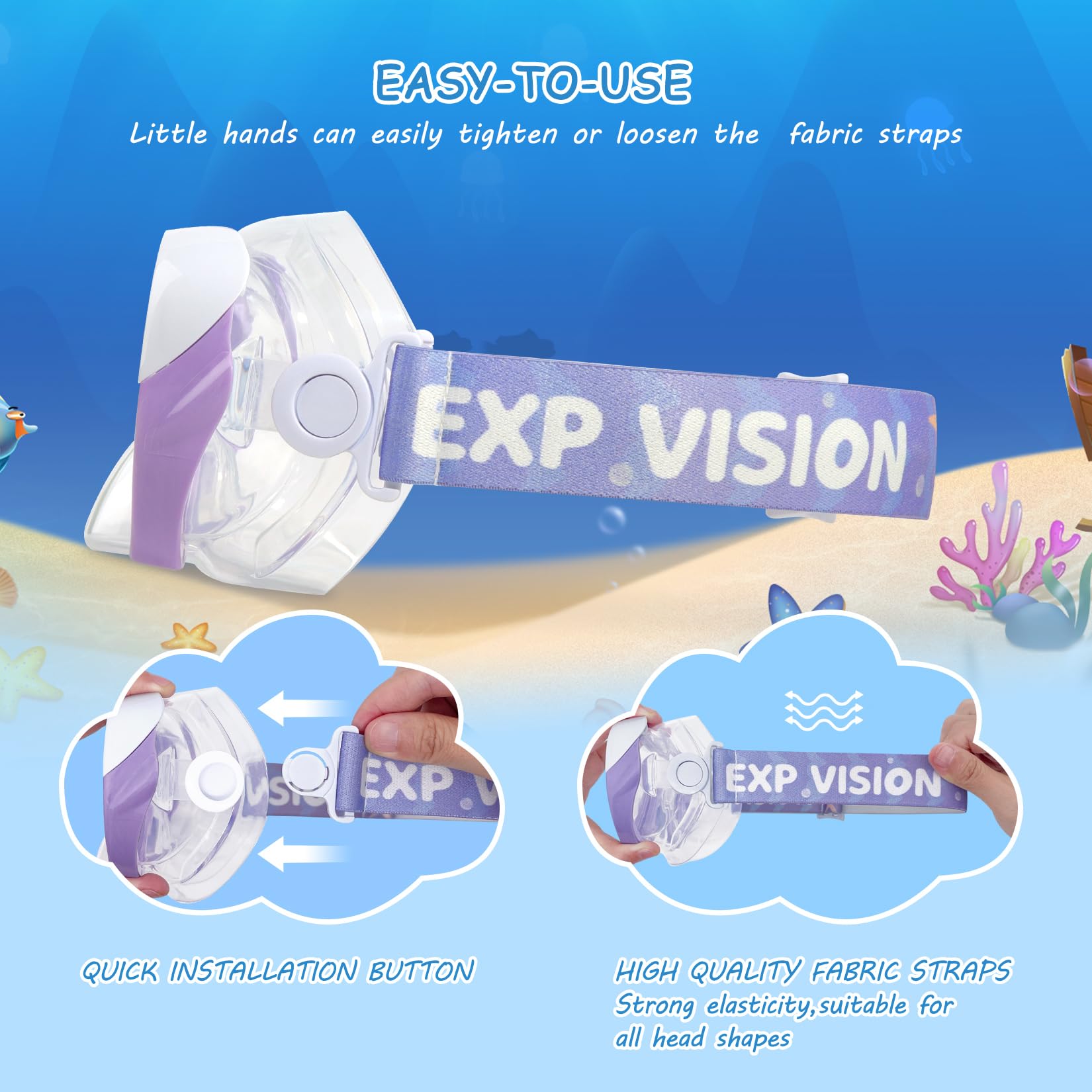 EXP VISION kids Swim Mask child Snorkeling Diving Mask Swim Goggles with Nose Cover For Kids Age 4-14 1. Anti-Fog Coating For Clear Viewing. 2. PC Lens For Extra Durability. 3.Single Lens Kids Snorkeling Mask Offering superior 180 views4. Soft Liquid Silicone Skirt Fits a Wide Range of Face Shapes. 5. 100% Anit -Leak Proof Design. 6. Kids Swim Goggles With Fabric Strap Never Pull Hair, Don 't Pinch Ears, and Are Easy to Use. 7. Speed Fit Buttons For Easy Head strap Adjustment. Kids Swim Goggles with Soft Nose Cover EXP VISION kids swim mask with soft silicone nose cover, which is needed to compensate for increasing pressure as kids swimming, snorkeling or diving. Kids swim goggles nose cover allows your kids to go underwater without having to hold their noses, and helps them gain much more confidence with swimming, snorkeling, or diving. Durable PC lens, provides the best protection for your kids eyes. It resists scratching and withstand deep-water pressures. Panoramic single-Lens Snorkel Mask Offering superior views over a standard kids diving mask, our single lens panoramic kids snorkeling goggles offers a 180 view for beautiful underwater adventures. So that your kids can capture every amazing moment in the sea and share it with her friends and family. Liquid Silicone Skirt and Fabric Strap will work great to protect your kids ' hair from pulling it as they put it on and took it off, providing an extremely comfortable user experience. NO HAIR PULLING - Soft fabric head strap slides right over long and curly hair without tangling. The kid 's swim goggle strap wont slip, so no more squished eyes and ears. These children swim mask are recommended for kids 4 - 14 years old. Upgraded Adjustment Buckle The swim mask upgraded button buckle can easily adjust the length of the strap and 180-degree up and down adjustment to fit all head sizes. EXP VISION kids snorkeling diving mask changes your kid 's field of view Its perfect for ocean snorkel trips and seeing coral reefs and sea creatures because your kids will get peripheral vision due to the design of the diving masks! Our EXP VISION kids snorkeling goggles gear products are mainly suitable for those aged 4-14, easy to use, and convenient to operate. This Kids Snorkel Goggles child Scuba Diving Mask Swim Goggles with nose cover This kids diving mask is perfect for beginners and experienced water enthusiasts. The features of a flexible skirt and durable adjustable straps are so important for a good fit and no leaks.