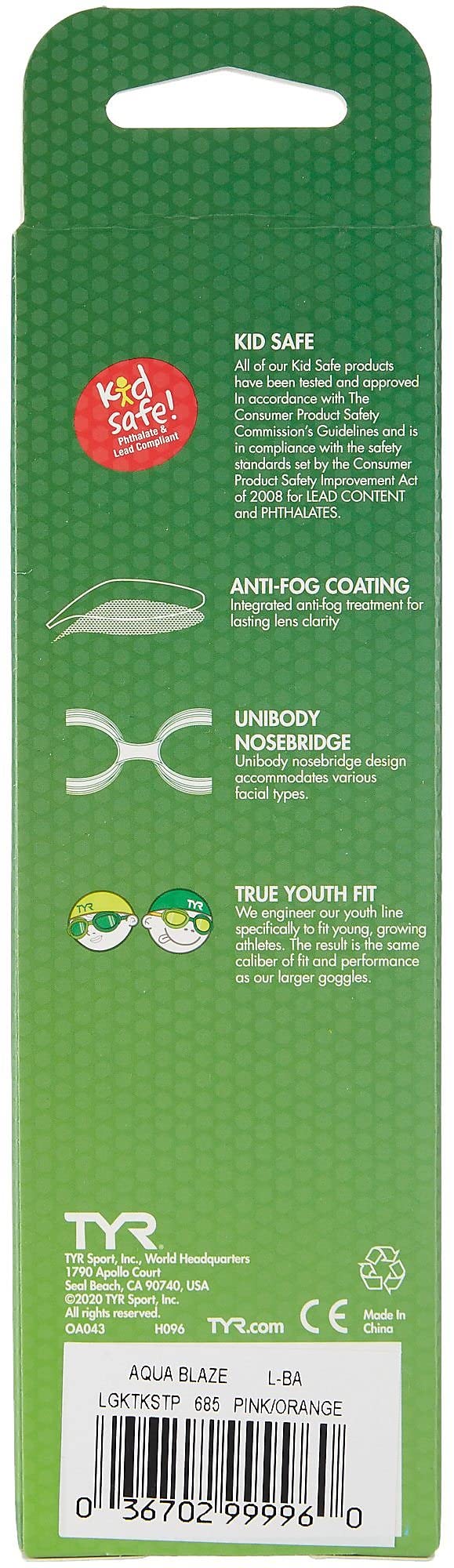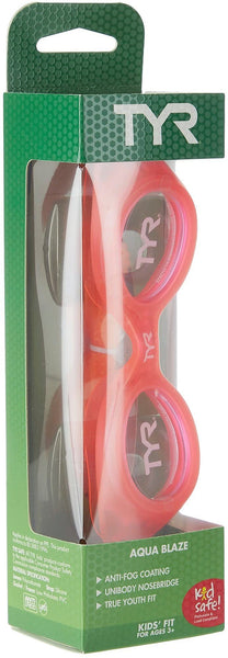 Start your child's swim adventure off right with TYR Aqua Blaze Kids' Goggles. Constructed with PVC gaskets, these swim goggles are ultra comfortable and come in an array of fun colors. In addition, all Aqua Blaze goggles feature optical grade, polycarbonate lenses with anti-fog and UVA/UVB protection, a unibody nose bridge, and thick head strap with grips for added comfort and a secure fit. All TYR kids' goggles have been tested and approved in accordance with the Consumer Product Safety Commission's guidelines. For Ages 3-11.