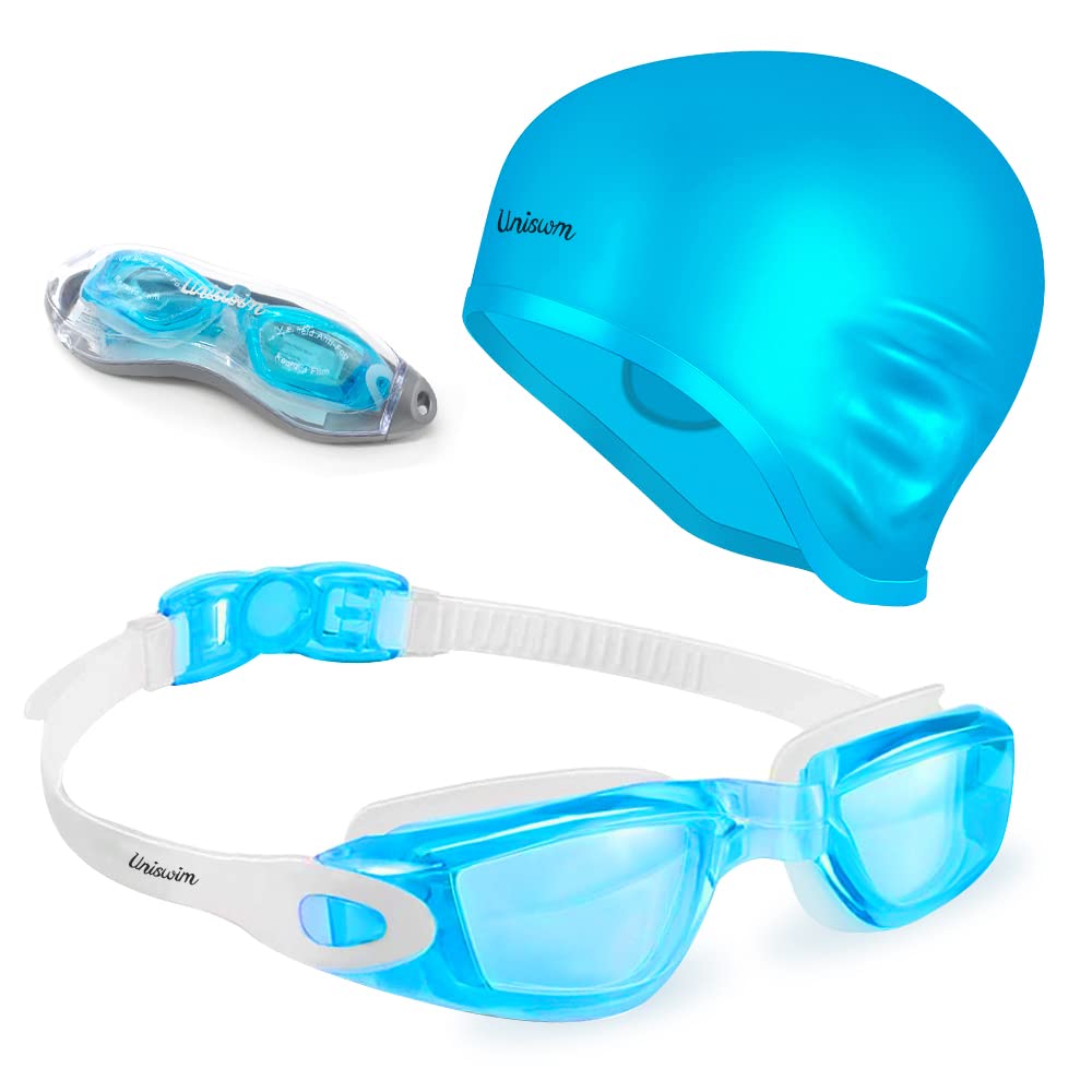 Uniswim Swim Cap And Goggles Set For Women Men With Anti Fog Glasses Clear Lens For Swimming (Aqua)