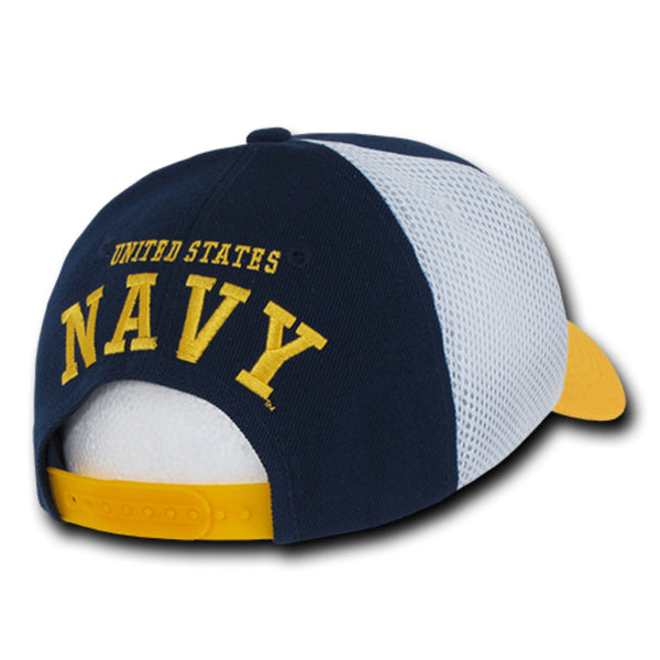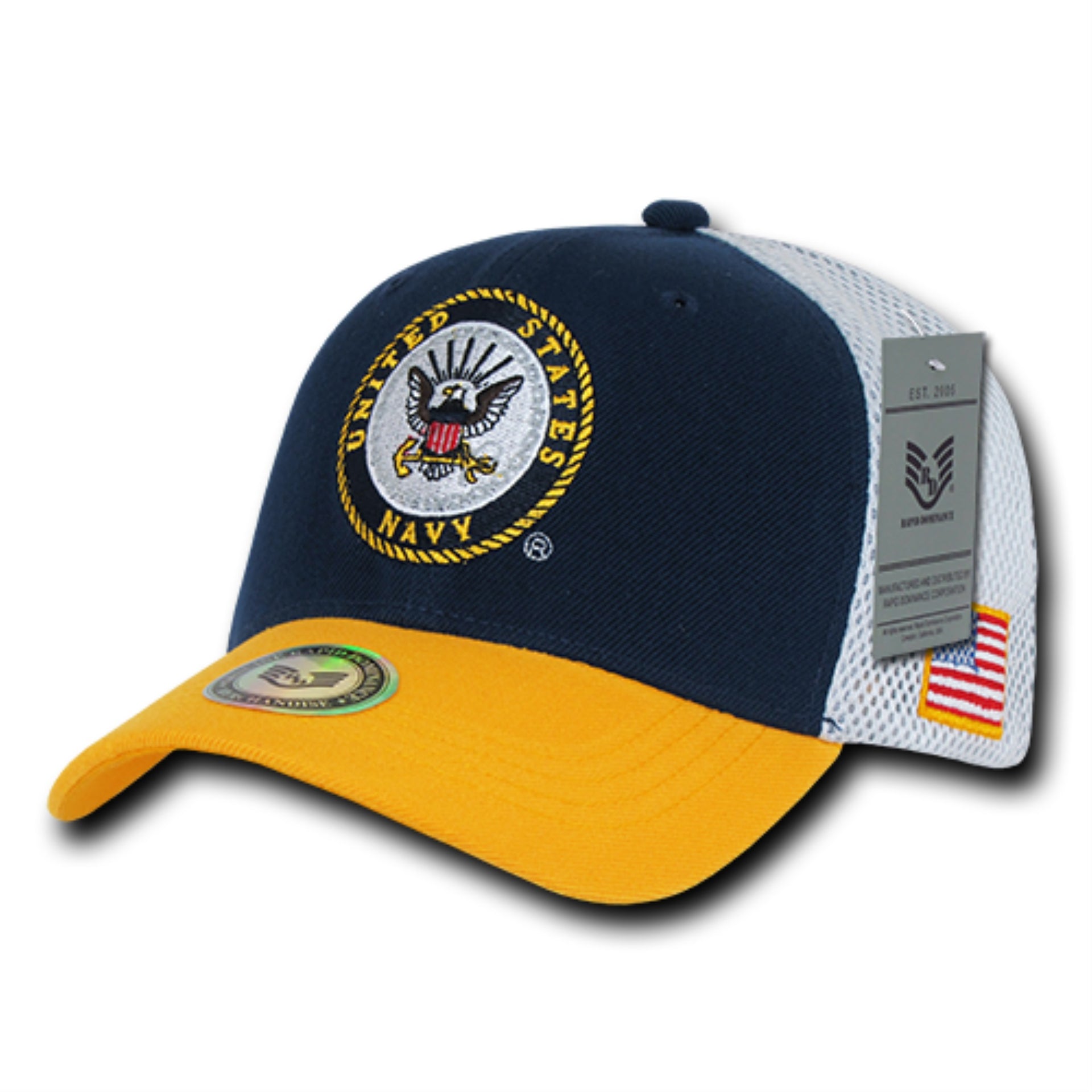 S010-NAVY Deluxe Mesh Military Caps, Navy, NvyGold, U.S. Navy Our Deluxe Mesh Military Logo baseball cap has a great old school look, with its half mesh and half solid crown, vintage plastic Snap Back and Flat Bill.This is a 6-Panel constructed cap that features High Definition embroidery on the crown an