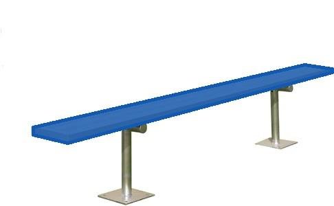 The best player's benches available. Guaranteed. Available in Royal Blue, navy Blue, forest green and Scarlet Red. Seat Planks are 10''; wide with a ribbed no-slip surface. Powder coated Planks allows you to show your team colors and keeps aluminum from rubbing off on your clothing. Comes with safety end caps -no sharp edges to snag clothing or skin. Legs are constructed of heavy duty commercial grade 2-3/8''; o.D. Galvanized steel. Mounts directly to the floor (mounting hardware not included). surface mount without back - 15' long.
