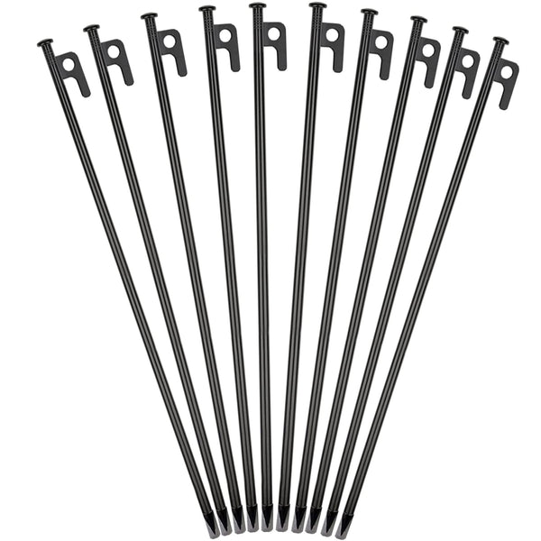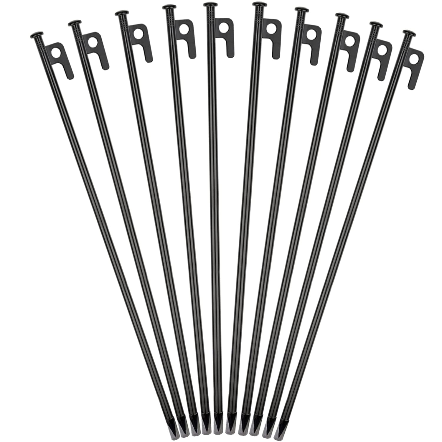 -tent stakes heavy duty well made -worked great extremely strong -Driving them into the ground was a breeze and removal was just as easy. Quality and durability are above standard. - holding power and never have to worry about breakage like the plastic ones. -much better than the original tent stakes - stakes are easy to drive into the ground, and provide a strong anchor for small to mid-size kites. -16inch extra longer large heavy duty tent stake