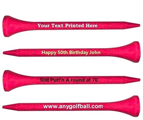 100 count Personalized 2 3/4'' Pink wooden Golf Tees Upload Your Own Text Personalized Pinl Golf Tees 100 count 1 or 2 Custom Lines of Text Quality Tees 2 ?Length Select your Text Color and Style Elevate your golf game with our set of 100 personalized 2 3/4 inch pink wooden golf tees. Crafted with meticulous attention to detail, these tees combine performance with a touch of vibrant style, offering a golfing experience that stands out on the green. Carved from high-quality wood, these tees are designed for durability and consistency in every swing. The 2 3/4 inch length caters to different club sizes, ensuring versatility and optimal ball positioning for various shots. The eye-catching pink hue adds a burst of color to your golfing gear, making a statement on the course. Beyond their functionality, these tees reflect your passion for the game and your personal style. Precision-engineered, these tees guarantee uniform ball placement, enhancing accuracy and distance for drivers and irons alike. Experience improved control and confidence as you tee off with precision. Customize each tee with your name, initials, or a special message. This personalization adds a unique touch, making them a thoughtful gift for fellow golf enthusiasts or a statement of your dedication to the sport. Packaged carefully, the set ensures easy organization and accessibility. The packagings design complements the tees vibrant appearance, creating a harmonious ensemble thats as functional as it is visually appealing. With 100 tees, youre fully prepared for countless rounds of golfing excitement. Whether youre a seasoned player or just starting out, these personalized 2 3/4 inch pink wooden golf tees will become an integral part of your game, reflecting your commitment to both performance and individuality.