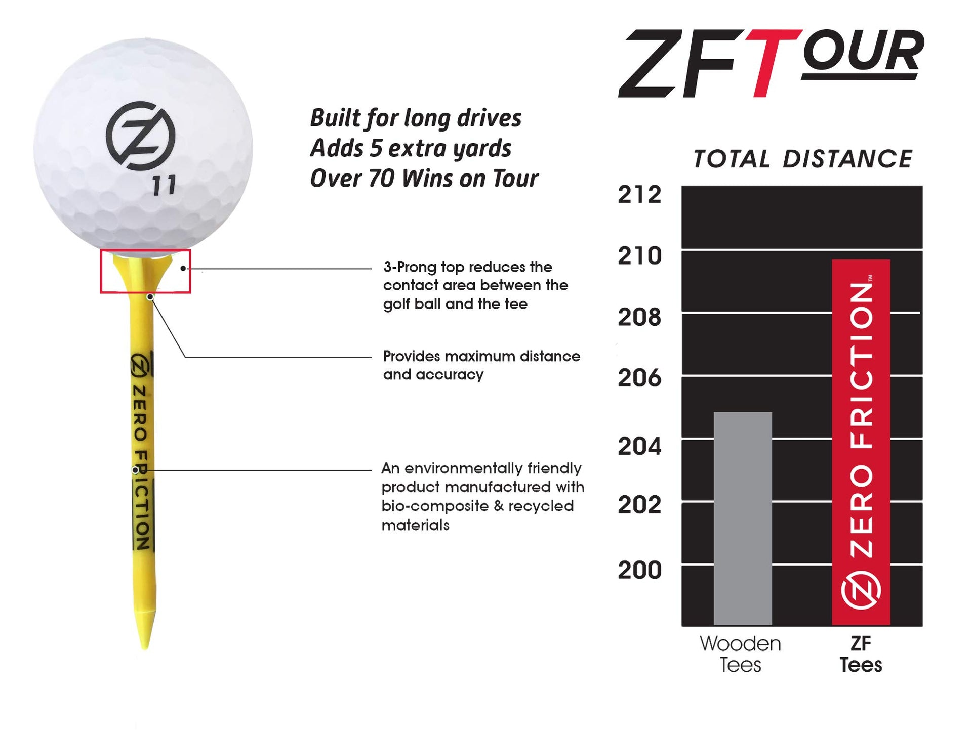 The Zero Friction Original 3-Prong Golf Tee has LESS RESISTANCE, which means MORE DISTANCE on the course. Our unique designed tee has a 3-prong top that significantly reduces the contact area between the golf ball and the tee, providing maximum distance and accuracy. Zero Friction has established itself as the No. 1 Performance Golf Tee on the PGA Tour with over 70 TOUR victories and more than 370 top-ten finishes. The Zero Friction Golf Tee is manufactured using bio-composite materials. for optimum performance, place one prong towards the target.