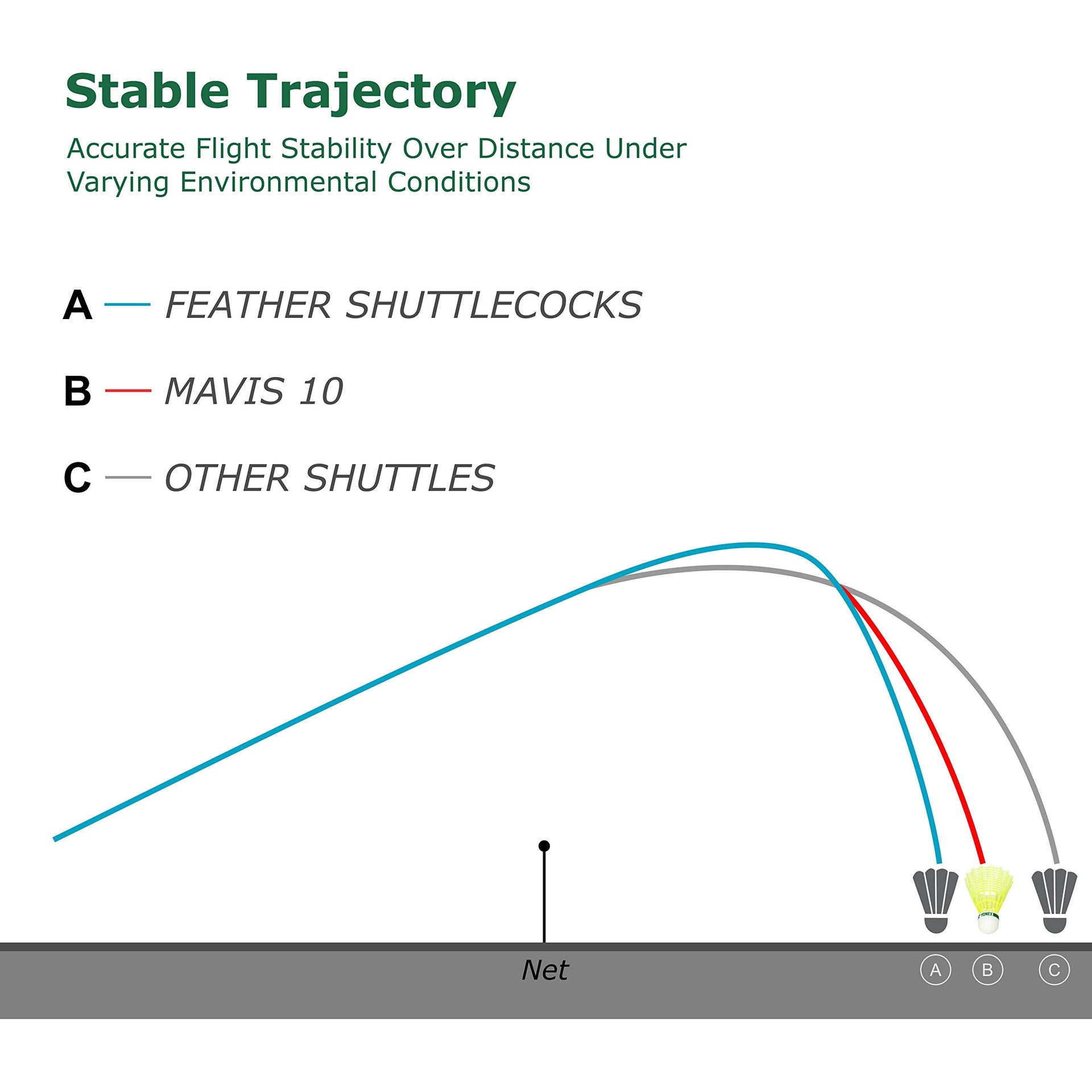 Color of tube Cap: GreenProper Speed: SlowDeveloped using the flight timing of feather shuttlecocks, Mavis Nylon shuttlecocks are precision designed and manufactured to provide accurate flight performanceWhen smashed, a Mavis shuttlecock recovers in only 0.02 seconds. This performance is just 0.005 seconds slower than a Yonex Feather shuttlecock and 0.08 seconds faster than the recovery of an ordinary shuttlecock