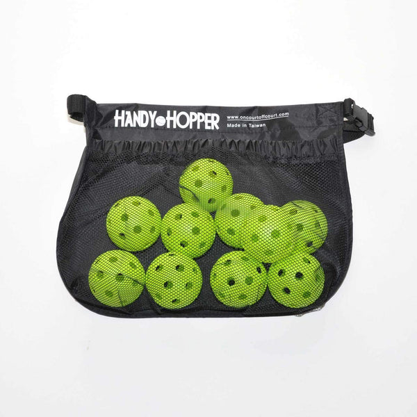 Improved Handy Hoppers now hold up to 36 balls great for travelling coaches No more cardboard boxes at tournaments Also convenient for high school and college coaches to rove courts and keep balls handy comfortable to wear around the waist Expandable pouches hold 36 tennis balls, 21 softballs, or 35 baseballs