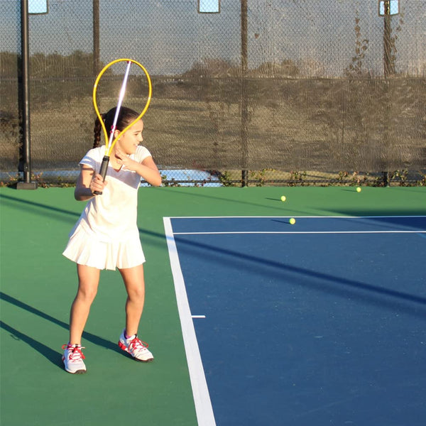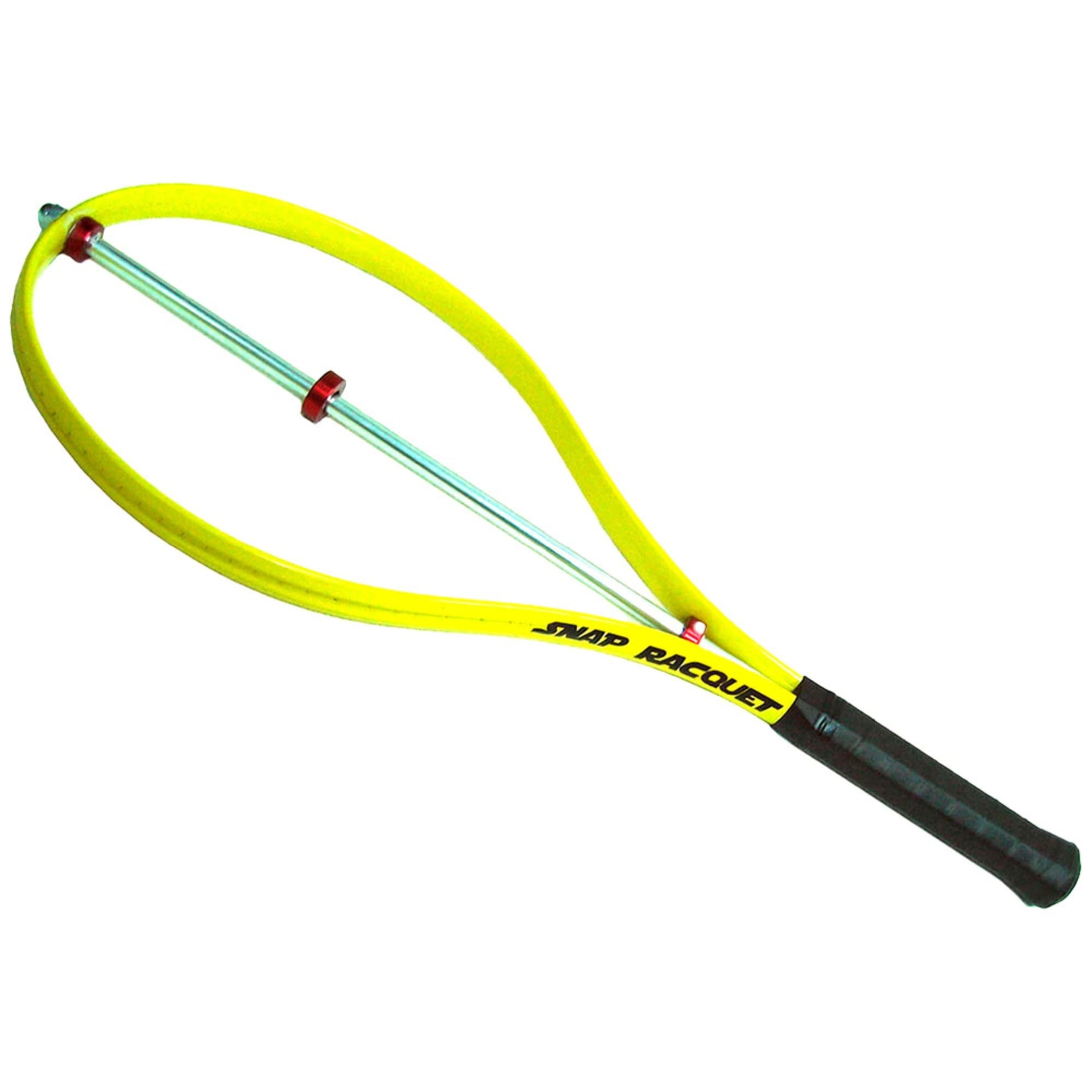 The Snap Racquet snaps at contact to help players accelerate like the top pros in the world! Perfectly weighted to use as a warm-up swing aid as well as a stroke and timing improvement tool. The Snap Racquet uses kinesthetic and auditory biofeedback to guide players to improve up to 4 times faster than without any guidance aid, according to clinical studies in sports training. Heres how it works: On every single stroke in tennis, the racquet head is either going up or going down at a very specific moment for correct and efficient technique. Every time the racquet head swings up or down, theres a loud snap. Every single stroke has an ideal time for that snap to take place. Helps all strokes! Perfectly weighted! Use as a warm-up swing aid or stroke and timing improvement tool. Includes detailed photo instructions.