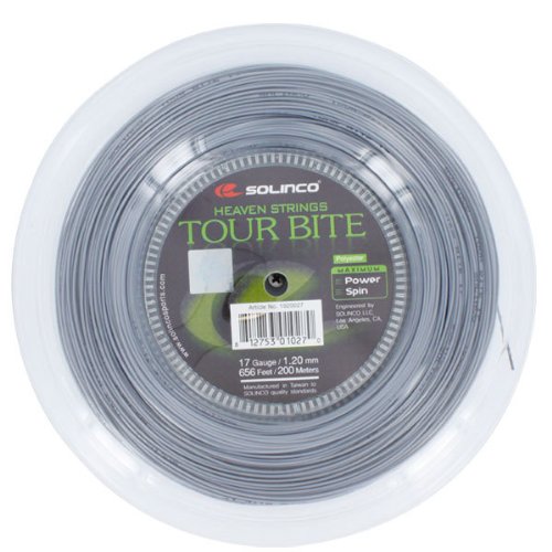 - Q: How long is the string reel of Solinco Tour Bite? A: The string reel of the Solinco Tour Bite measures 656 feet.