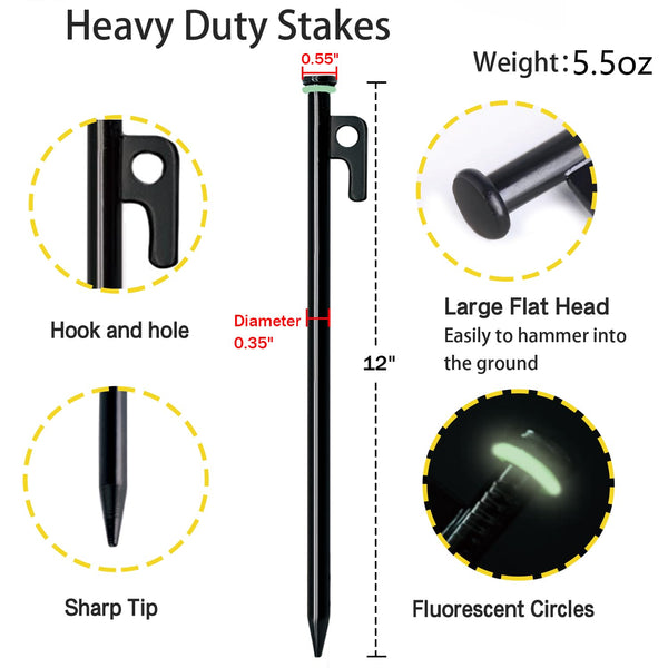 Specifications: Item name: Tent Stake and Camping Hammer Kit Material of tent stakes: S45C forged steel Material of tent hammer: Carbon steel Material of storage pouch: 480D Oxford cloth Size of tent stakes: 12in Size of hammer: 12in Package Size: 12 x 5 x 2 Package weight: 1.2LB Package list: 12 12in tent stake 1 Tent hammer 12 Fluorescent rings 1 Storage pouch
