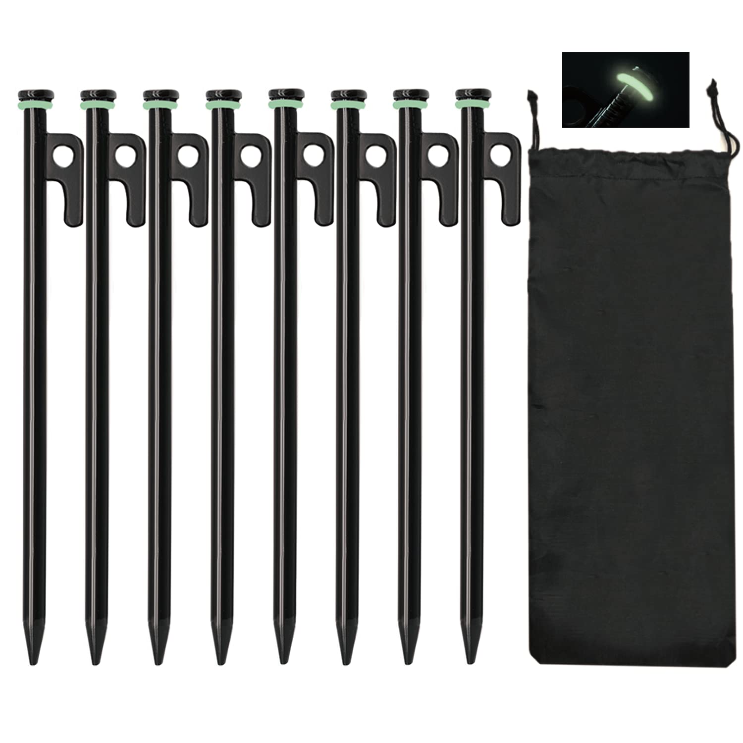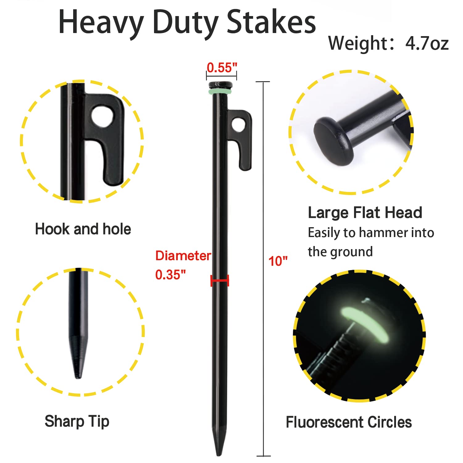 Specifications: Item name: Tent Stakes Material of tent stakes: S45C forged steel Material of storage pouch:480D Oxford cloth Size of tent stakes: 10in Package Size: 12 x 5 x 2 Package weight: 1.2LB Package list: 8 10in tent stake 8 fluorescent rubber rings 1 Storage pouch