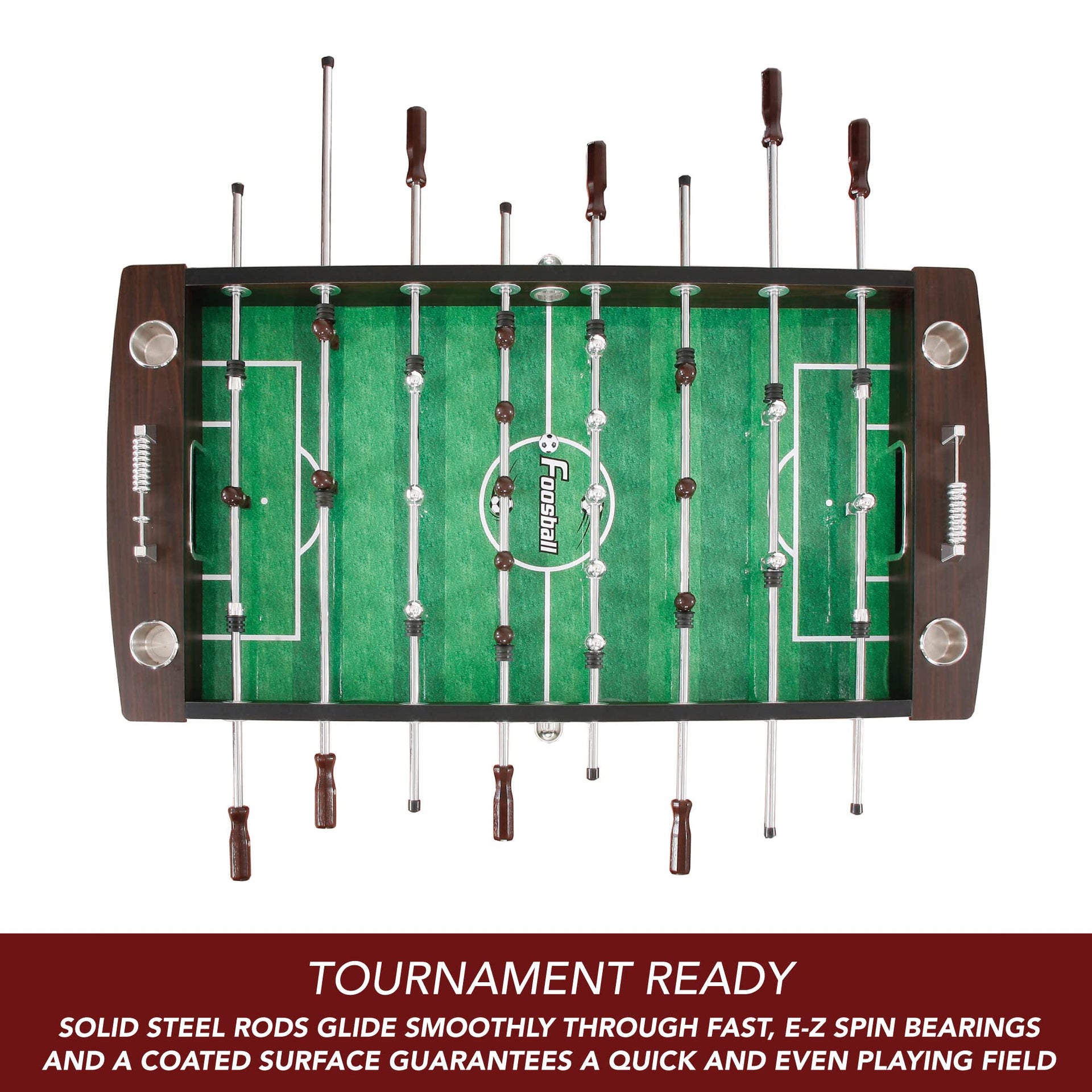 This premium-grade Hathaway 56-in Soccer Table is our highest quality foosball table. Constructed of CARB certified MDF, the stylish gaming table cabinet has a durable exterior melamine with a beautiful espresso finish. The sturdy box leg design and cross support beams give the table added stability. The playfield is cross supported to ensure a true level surface for accurate table play. The solid stainless steel rods, E-Z spin bearings and ABS counterbalanced players keep the ball in play for continuous fast paced action! The Primo foosball table was not only designed to look good, it was designed to play excellent. 180-day limited warranty.