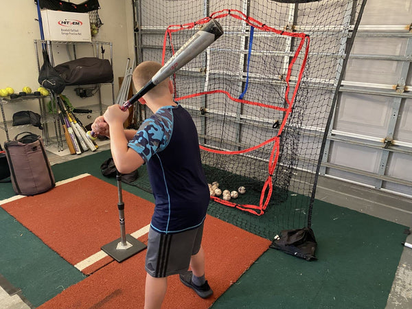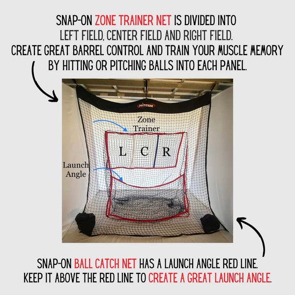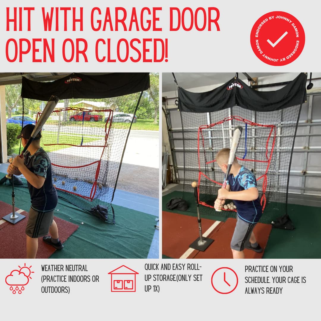 Hitting off the tee is one of the best things you can do to become a better hitter. With this net, there are no more excuses! HitZem practice net is an indoor/ outdoor practice net with a patented design for effortless setup and storage. The net is stored in the patented storage sleeve, that easily attaches to your garage door- no tools needed. To use, unhook the storage sleeve straps and open the garage door so that the net falls into place. Spread the net, weight the corners, and begin batting or pitching. The sturdy net is designed to collect balls without allowing them to bounce back. Net Size: 7 ft. 8 in. wide x 8 ft. tall. Vinyl Sleeve: 7 ft. 8 in. wide x 14 in. tall. Grommets: 6 on sleeve to attach net. Sock Net: 5 ft. x 5 ft. (to catch balls).