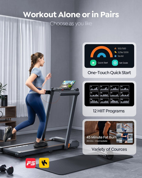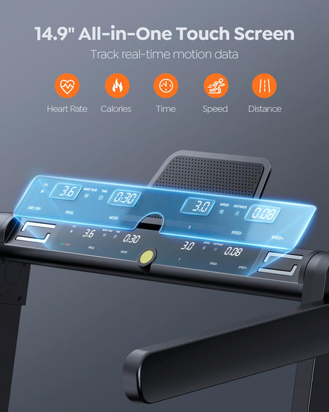 ?Smart Treadmill with Apps & Bluetooth Speaker?Take your workouts to the next level! This walking pad treadmill features 12 HIIT modes and a built-in Bluetooth speaker, making every session fun and effective. Sync with apps for real-time workout tracking, coaching sessions, and global running challenges. Inviting you to unlock more ways to play and have more fun while burning fat! | ?Powerful, Stable & Quiet Motor?Portable treadmill with 2.5HP motor provides speeds of 0.6-10MP to support switching between walking and running at will, 300lbs weight capacity, which can meet the exercise needs of you and your family at different stages better. Easy to maintain exercise even inclement weather. Built-in cooling system and ultra-quiet operation, say goodbye to worry about disturbing your family or others. | ?Spacious Running Area & Advanced Shock Absorption?Designed for comfort and safety, this walking pad with 5-layer anti-slip running belt (40.9'' x 16.5'') provides ample space to run naturally. The 8 built-in silicone shock absorbers reduce impact on joints, protecting your knees and muscles. Sturdy side armrests offer extra stability, making workouts safer and more comfortable. | ?2 in 1 Foldable Treadmill with LED Touch Screen?This under desk treadmill offers dual modes: use it with the handlebar for running or fold it down for walking while working. The 14.9'' LED touchscreen displays real-time speed, distance, time, and calories burned. Stay active whether you're working, watching TV, or on a call! | ?No Assembly, Easy Storage?Designed for small spaces, compact treadmill comes fully assembled and features built-in transport wheels for easy movement. You can store it under a bed, sofa, or in a corner when not in use. Perfect for home or office fitness! Acezoe offers 24/7 service, 2-year protection and lifetime technical support. Any problem please contact our after-sale email.