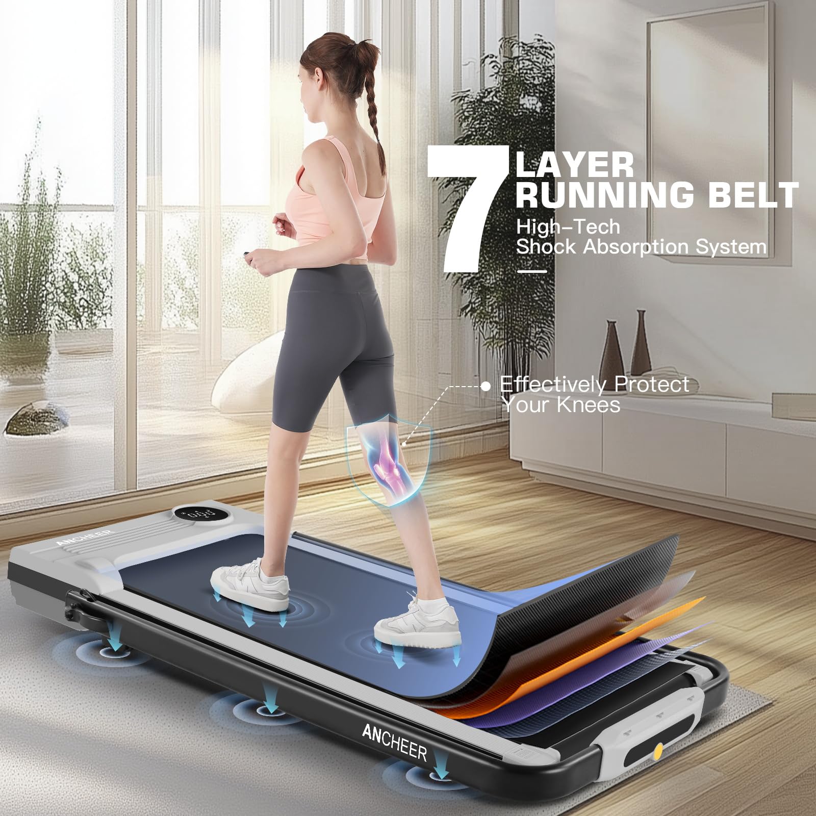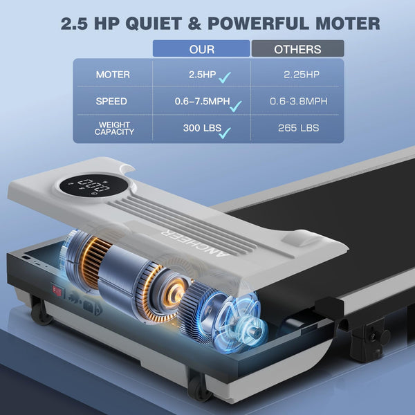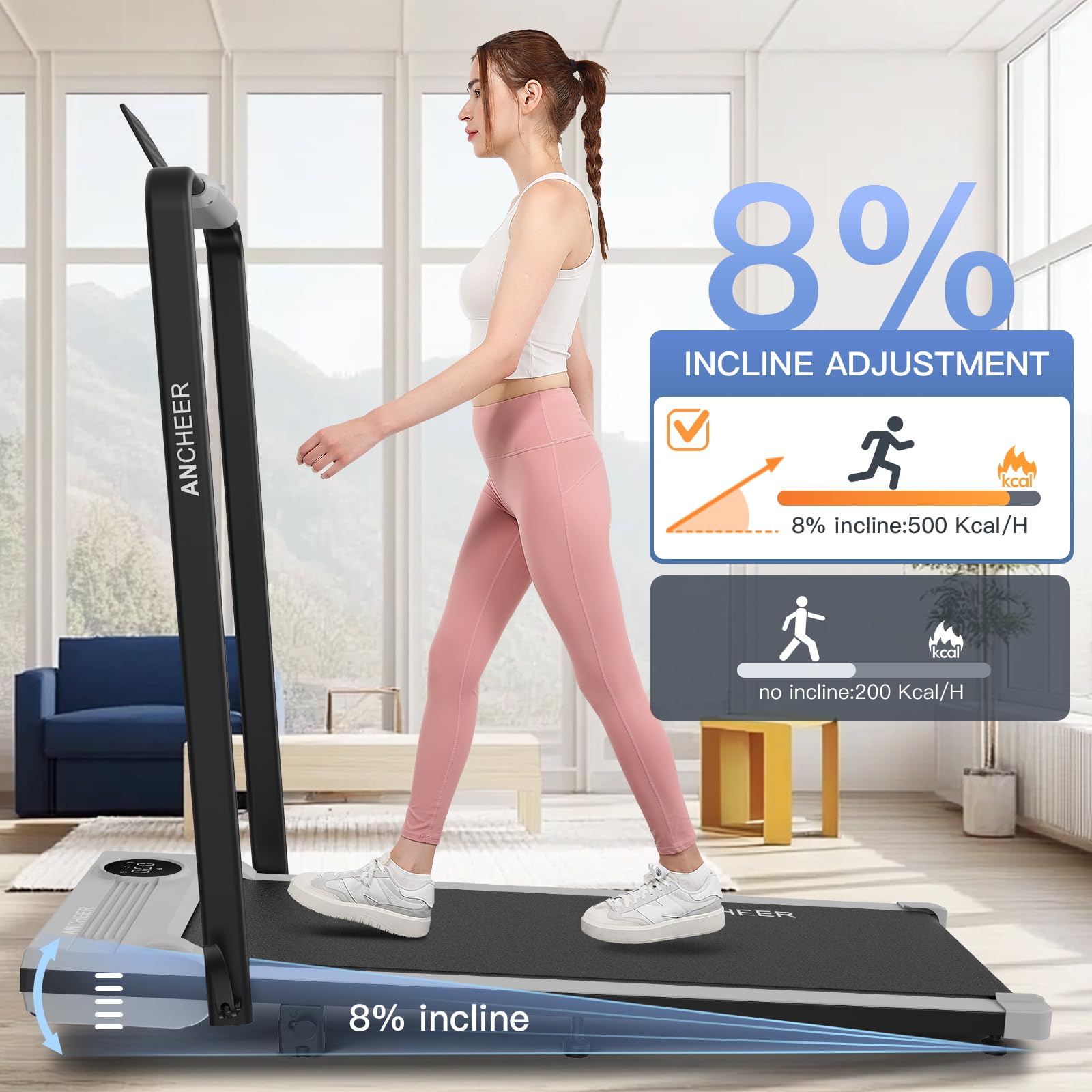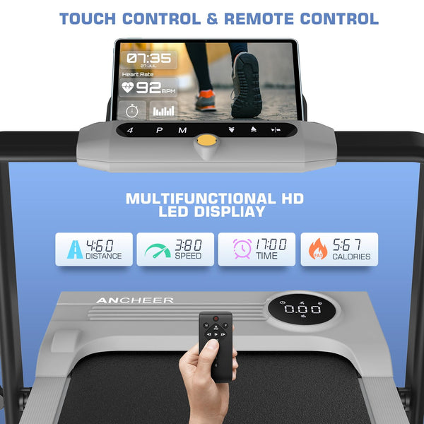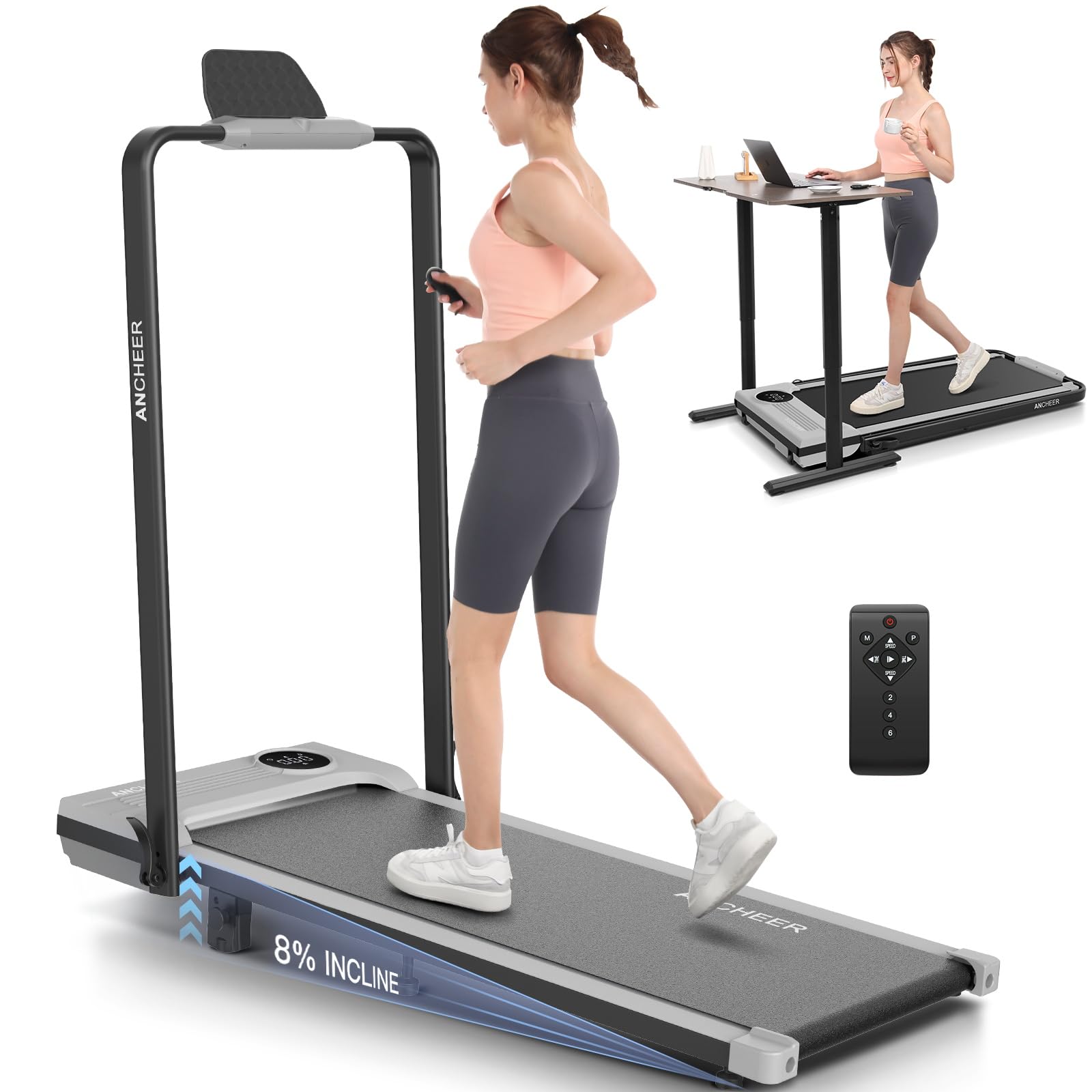 **ANCHEER Folding Treadmill with Incline - Perfect for Home and Office**Experience the ultimate in fitness convenience with the ANCHEER Folding Treadmill, designed to seamlessly integrate into your busy lifestyle. Whether you're looking to stay active at home or need a discreet under-desk treadmill for your office, this versatile machine is the perfect solution.**Key Features:**- **Foldable Design:** The ANCHEER Folding Treadmill is engineered with a space-saving design that allows it to be easily folded and stored when not in use. Ideal for small apartments, homes, or offices, it ensures you can keep up with your fitness routine without sacrificing valuable space.- **Adjustable Incline:** Take your workouts to the next level with the adjustable incline feature. Tailor your workout intensity to match your fitness goals, whether you're aiming for a challenging hill climb or a more relaxed walking session.- **Sturdy Handle Bar:** Equipped with a sturdy handle bar, the ANCHEER Treadmill provides additional support and stability during your workouts. This makes it especially suitable for users of all fitness levels, ensuring a safe and comfortable exercise experience.- **300LBS Weight Capacity:** Built to last, the ANCHEER Treadmill supports up to 300 pounds, making it a reliable choice for a wide range of users. Its robust construction guarantees durability and longevity, so you can focus on achieving your fitness goals without worry.- **Under Desk Treadmill:** Transform your workday into an active one with the under-desk functionality. Stay productive while getting in some steps, making it easier than ever to maintain a healthy, active lifestyle even in the busiest of schedules.