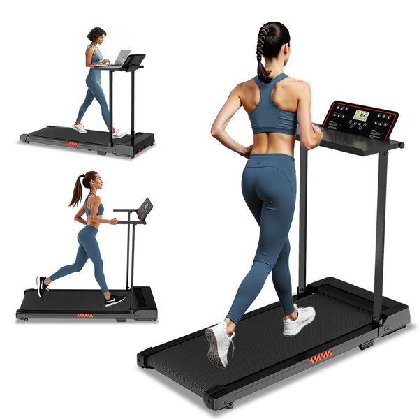 This Treadmill Fits Into Compact Spaces. It Supports Users Weighing Up To 320 Pounds-Ideal For Home Treadmill Enthusiasts Looking For Durability And Noiseless Operation.The Led Display Shows Speed (0.6-7.6 Mph), Distance, Time, And Calories Burned For Real-Time Tracking Of Your Running Progress. The Bottom Of The Treadmill With Desk Is Fitted With 8 Shock Absorbers And 5 Layers Of Large Non-Slip Straps To Give You A Smooth, Comfortable Feel And Virtually Eliminate Any Impact On Your Joints. Stay Fit With This Walking Pad With Handle Bar, You Can Choose At Will From 12 Preset Modes By Manual Which Offer Varying Speeds To Fit Different Fitness Routine.