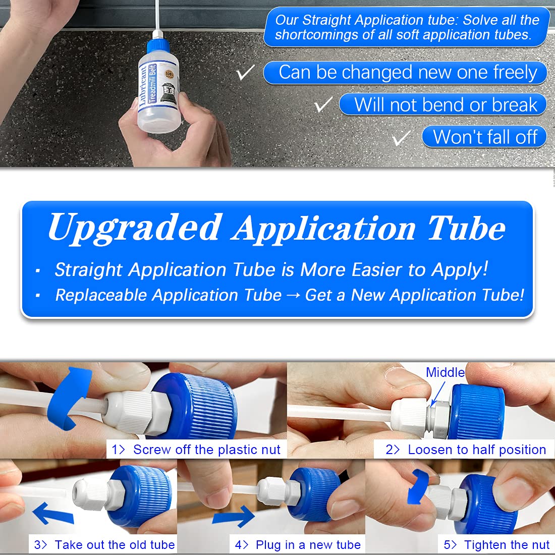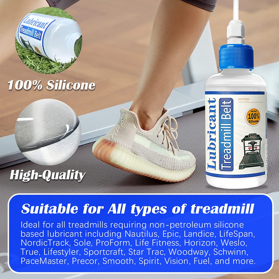 This product is made of silicon and is specially customized. The product has no odor and propellant. Very easy to use. We provide each customer with two hard application tubes (the soft ones are not easy to use), two pointed bottle caps (to meet the needs of different customers), and 10 pieces of oil absorbing wipes (if the lubricant is spilled, you can use the wiping cloth to dry them). Our products provide better and meticulous service and products for each customer. Protect your treadmill, let it have better performance! I wish you a happy use and a healthier body!