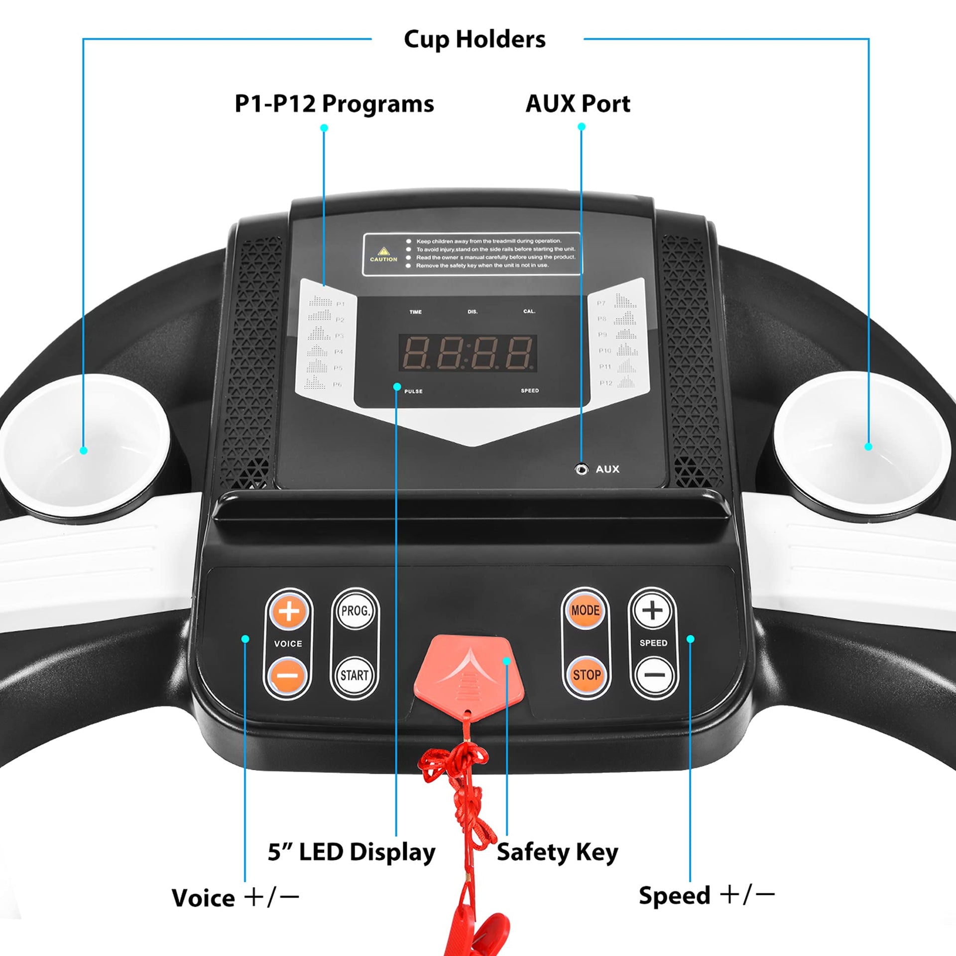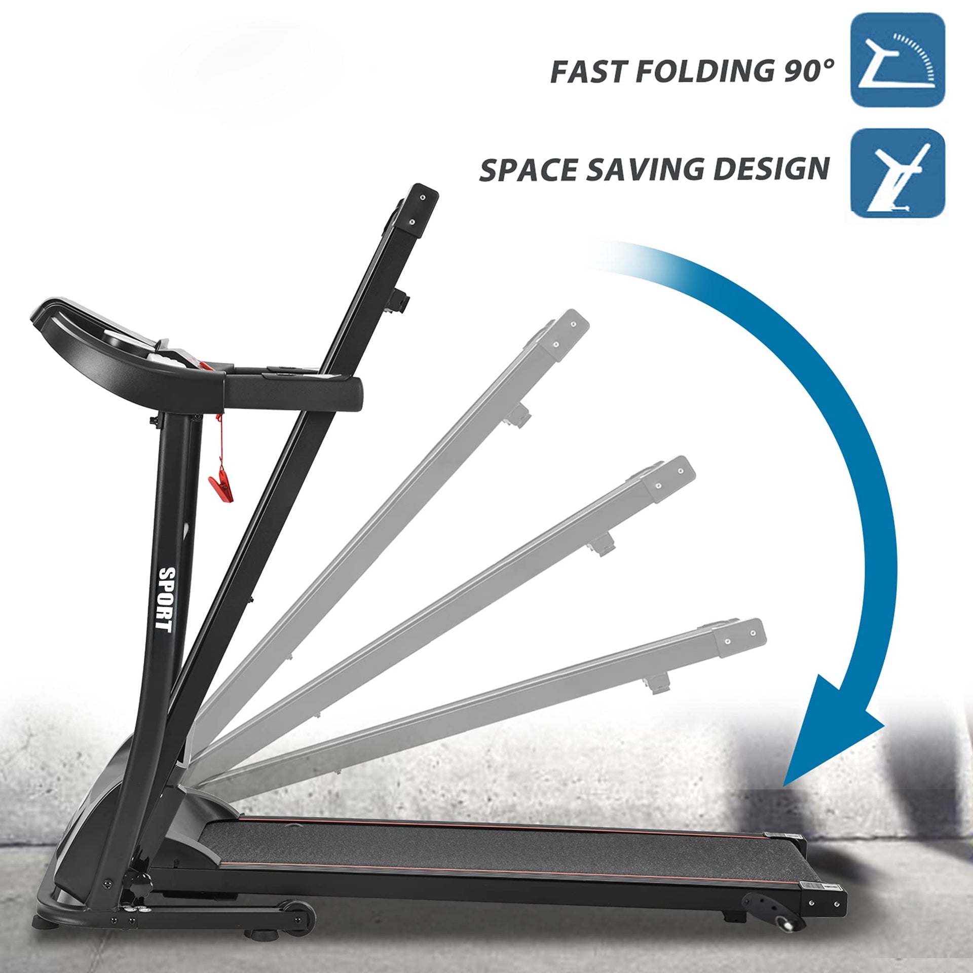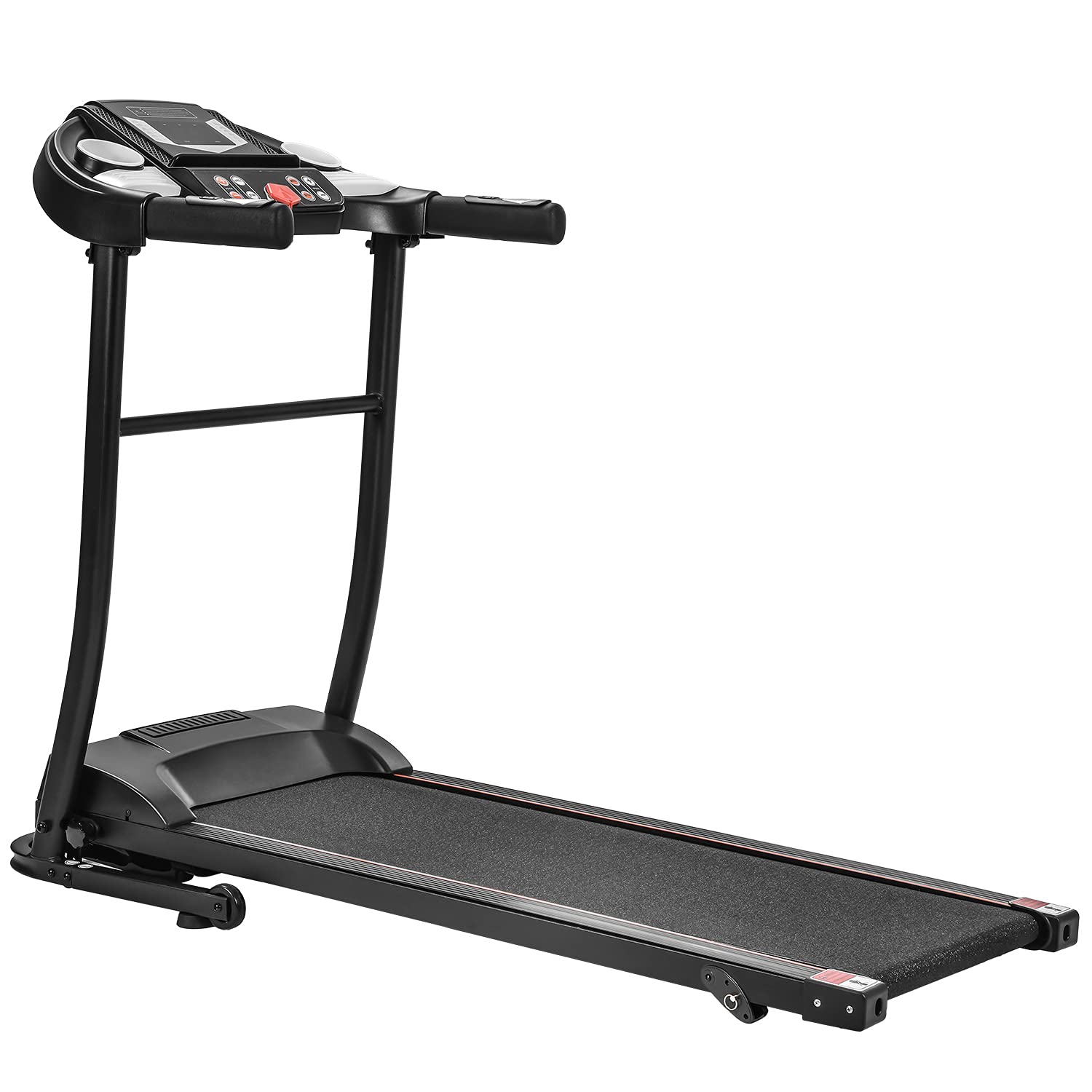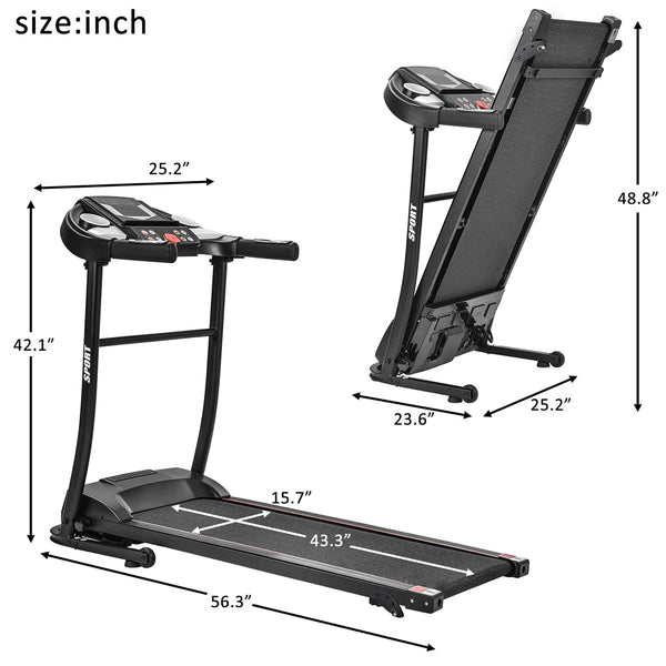 Tackle at-home fitness with the Folding Treadmill, manufactured with home fitness in mind to make working out indoors that much easier and more effective with a compact, foldable, easy to use design that doesnt take up space. Top quality 16 inch wide grass patterned belt provides optimum tread while offering enough space to walk, jog and run comfortably. Monitor the running time, distance traveled, heart rate calories burned with the 5 LED display so you can see your progress and set goals during your workout. Formulated with speed function on an easy to use interface, target specific muscles that you want to train with ease or choose from the pre-set interval training programs. Coming with a 1 Year Warranty for the frame and motor, invest in your health and take working at home to the next level with the Folding Treadmill. Integrated Tablet Holder Latest technology at your fingertips using the built-in device shelf that keeps your tablet or phone secure and conveniently close MP3 and Audio Auxiliary Port Stay motivated during your workout by listening to your favorite playlist while you run through the built-in dual speakers or through your headphones with the included headphone audio port Prevent Slipping Belt Design Grass pattern anti-slip belt design provides optimum friction for enhanced grip and traction while you running EKG Grip Pulse Sensor Monitor and maintain your target heart rate for optimal fitness results, simply grip the sensors and then watch on the display for a quick read Powerful vacuum Motor And Safety Emergency Stop Key Premium vacuum motor reduces noise while running indoor while the safeguard emergency stop key keeps you in control at all times, stopping the treadmill when pulled for your safety Excellent Treadmill Belt Deck Treadmill deck provides essential supportive cushioning for ankles, back, knees and joints for enhanced running comfort and aid in muscle recovery Easy Assembly Machine comes fully with all required tools and instructions and assembled, simply unfold it and tighten the screws Specifications: Unfolded dimensions: 56.3''L x 25.2''W x 42.1''H(in use) Running surface: 43.3''L x 15.7''W Weight: 73LBS Weight capacity: 240lb Speed: 0-12KM/h Input power voltage: 110V Package dimension:57''L 27''W 10''H Package weight: 78.59lb Notes: For optimum results, before using, please let the machine run for an hour on itself.