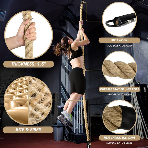 WHY SHOULD ADD ROPE CLIMBING INTO YOUR WOD?Climbing ropes are a must-have item for upper body strength training. They are essential for conditioning for boot camp, obstacle course race, wrestling, gymnastics, and more. To execute a strong rope climb, your body must be functioning effectively. Through a rope climb, you can train a large number of muscle groups and allow them to communicate with one another. Rope climbing is a great way to develop grip strength, burn fat, improve endurance, and increase aerobic activities.HIGH-QUALITY GYM CLIMBING ROPEYes4All Climbing Ropes offer three different length options 10ft, 15ft, and 20ft with 1.5-inch diameter, which allows users to adjust their exercise intensity by altering rope length - ideal for both professional and amateur sports lovers. The braided hemp rope is extremely durable to last for many climbs without fraying. The material is easy on your hands, so you don't have to worry about ripping, burning, or tearing. Each rope features heat shrink end caps to prevent the rope from fraying over time. These ropes will endure years of usage to support your active lifestyle. Plus, the heavy-duty metal eyehook at the top of the rope is easy to use. You can attach it on any fixed point to do climbing exercise and strength training. These ropes arrive without any knots, so you can either keep them knotless for a challenging climb or customizeknots for your workout.PRODUCT SPECIFICATIONSLength options: 10, 15, 20ftDiameter: 1.5 inchMaterial: Hemp rope + steel hookMax weight capacity: 500lbs.WARRANTY30-day return and 1-year warranty (contact seller for more details).