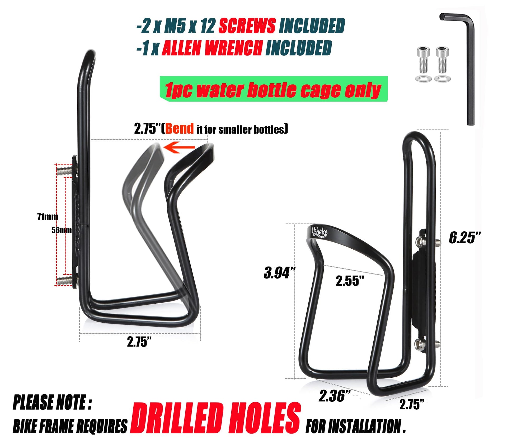 Ushake Water Bottle Cages, Basic Mtb Bike Bicycle Alloy Aluminum Lightweight Water Bottle Holder Cages Brackets(1Pc Pack- Drille