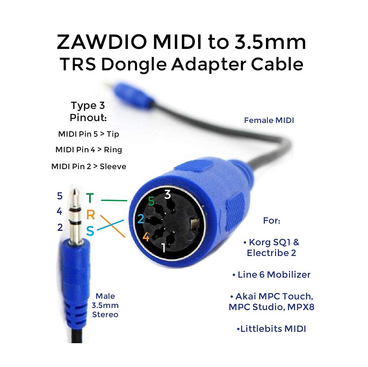 MIDI to TRS 35mm male Type A Its approximately 20 cms long end to end Thinner MIDI devices have manufacturers moving to an external dongle to accommodate the wider midi plug Zawdio introduces our MIDI TRS Type A cable This is a non-standard pinout Midi to 35mm cable built to replace the missing MIDI dongle from the following manufactures This pinout, commonly called the Type A cable, is is compatible with: 16N Faderbank Addac 221 222 Akai Force Akai MPc Studio Studio Black Akai MPc Touch Akai MPX-8 ALM Busy circuits PEXP-2 Expander Boss Rc-10R critter guitari Organelle M gen 2 Dreadbox LilA Erebus Empress Zoia Intellijel Palette Jakplugg Threshold Korg Electribe Sampler Electribe 2 Korg SQ-1 SQ-64 Korg NTS-1 Line-6 Mobilizer Littlebits - MIDI Module LPZWmodules WK3, Schleuig, Tram8 M-Audio Air 192 14 Make Noise 0-coast Michigan Synth Works mBrane Michigan Synth Works Threshold Mod Dwarf Monome crow MXMXMX c2M Novation Launchkey Mini Pro (MK3) Novation Launchpad Pro MK3 (NOT MK2 that is Type B Red cable) Retrokits Rk-006 Rk-008 SDS Digital WiFiMIDI Squarp Rample Supercritical Synthesizers Demon core Expander Teenage Engineering OP-Z Teenage Engineering Acid8 MKIII Twisted Electrons AY3 Twisted Electrons crazy8 crazy8 Beats Twisted Electrons Hapines L Twisted Electrons TherapSid MKII Westlicht Per Former XOXO Modular MidiXO Zetaohm FLXS1 Please note this is NOT compatible with several models by other manufacturers check compatibility with our other cable with a different MIDI-pin arrangement, if you do not see your product listed