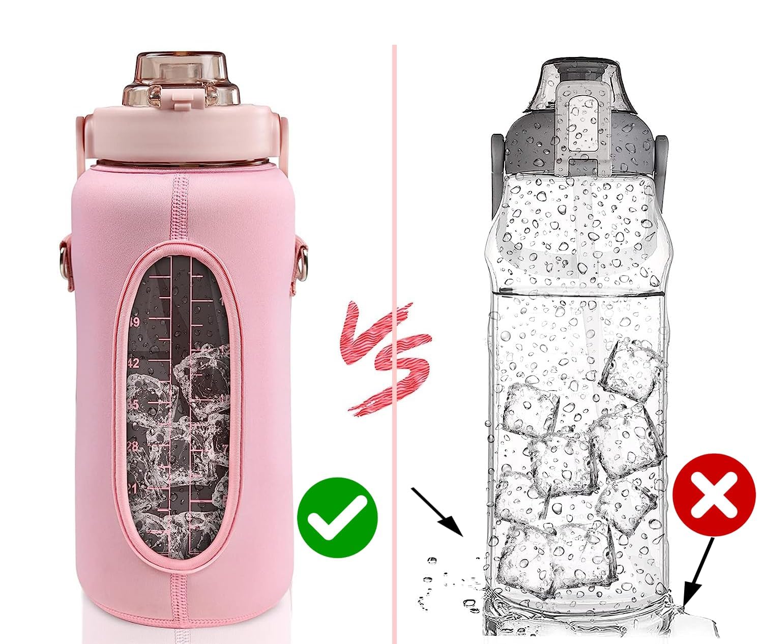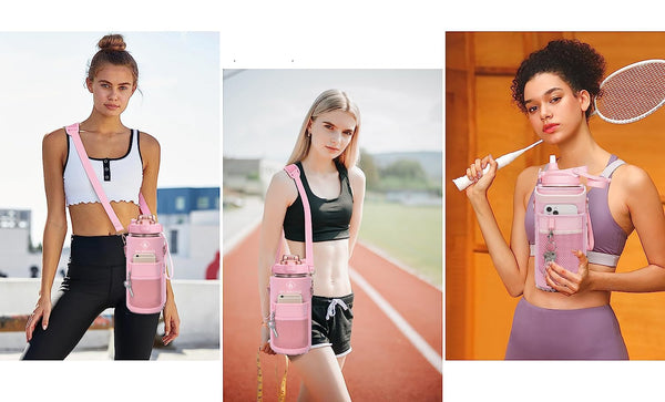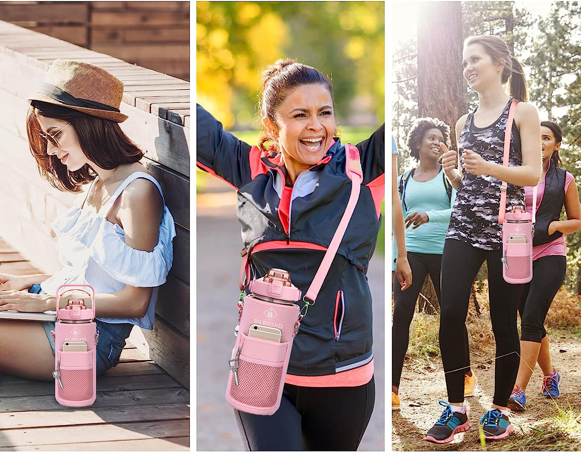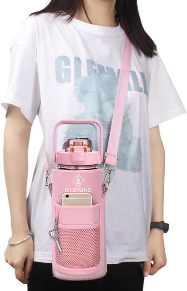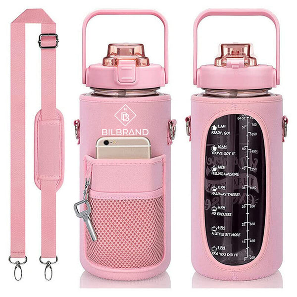 Brand: Bilbrand High quality Tritan bottle, BPA free, odor free Carrying bag: High-quality neopen with adjustable shoulder strap Functional pocket: phone holder, earphones, card, keys Leakproof: Sturdy lid with silicone seal Wide bottle neck: fill ice cubes, fill the bottle quickly, easy to clean Robust carrying handle: Practical for all outdoor activities Straw: Wide pop-up straw makes drinking easier Keeps the water fresher longer Motivational text: The daily water intake is guaranteed