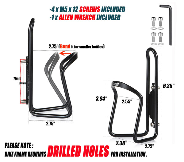 Specifications: Material: 6061-T6 HEAT-TREATED ALUMINIUM ALLOY Net Weight: 2.1OZ (61g) x 2 pack Dimension: 72mmx62mmx150mm (LxWxH) Accessory 1#: 4 X M5 x 12 Screws + Washers INCLUDED Accessory 2#: 1 x 4mm Allen Wrench INCLUDED PLEASE NOTE - bike frame requires threaded holes for installation of cages Features: A good accessory for cycling sports. Ultra-light weight for reducing burden . Tight grip for your drink bottle. Won't rust, break, or scuff with the metal material. Brings much convenience for your outdoor sports and travel. Simple and practical design, easy to carry. soporte para botellas de agua para bicicleta?????????????????????support de bouteilles d'eau de v loFahrrad Wasserflaschenhalter soporte de agua para bicicleta??????????????????porte-eau pour v loWasserhalter fr Fahrrad