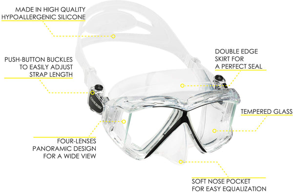 Change your field of view. A comfortable mask for the pro, the semi-pro, and all lovers of the sport who want to see the underwater world more clearly. The Cressi panoramic masks have been designed to give you great visibility, fit, durability and comfort. You'll get a clear look at what's going on in any dive environment and our eye-catching translucent colors will let you outshine the brightest fish. The masks are made of hypoallergenic soft silicone to ensure perfect sealing. Soft nose pocket for easy equalization. The lenses are made in tempered glass for safety and easy-to-clean. Push-button buckles to easily adjust strap length. The Supernova Dry is the first submersible dry top snorkel of Cressi. Great for anyone from youth to adults, for anyone who wants to feel much safer when they are snorkeling. The dry top valve eliminates water entry when submerged. A soft silicone mouthpiece reduces drastically jaw fatigue. The Pano 4 & Supernova Dry is a great equipment to use while snorkeling and scuba diving. The Pano 4 & Supernova Dry combo is designed by Cressi and made in Taiwan. Cressi has been an Italian brand pioneer in Scuba Diving, Snorkeling, and Swimming equipment since 1946. The product is covered by a 2-year limited warranty.