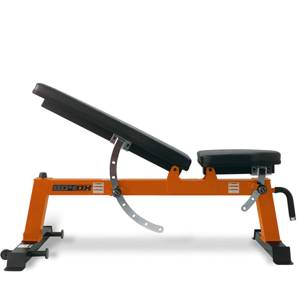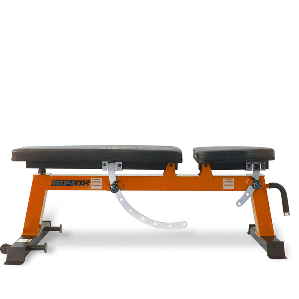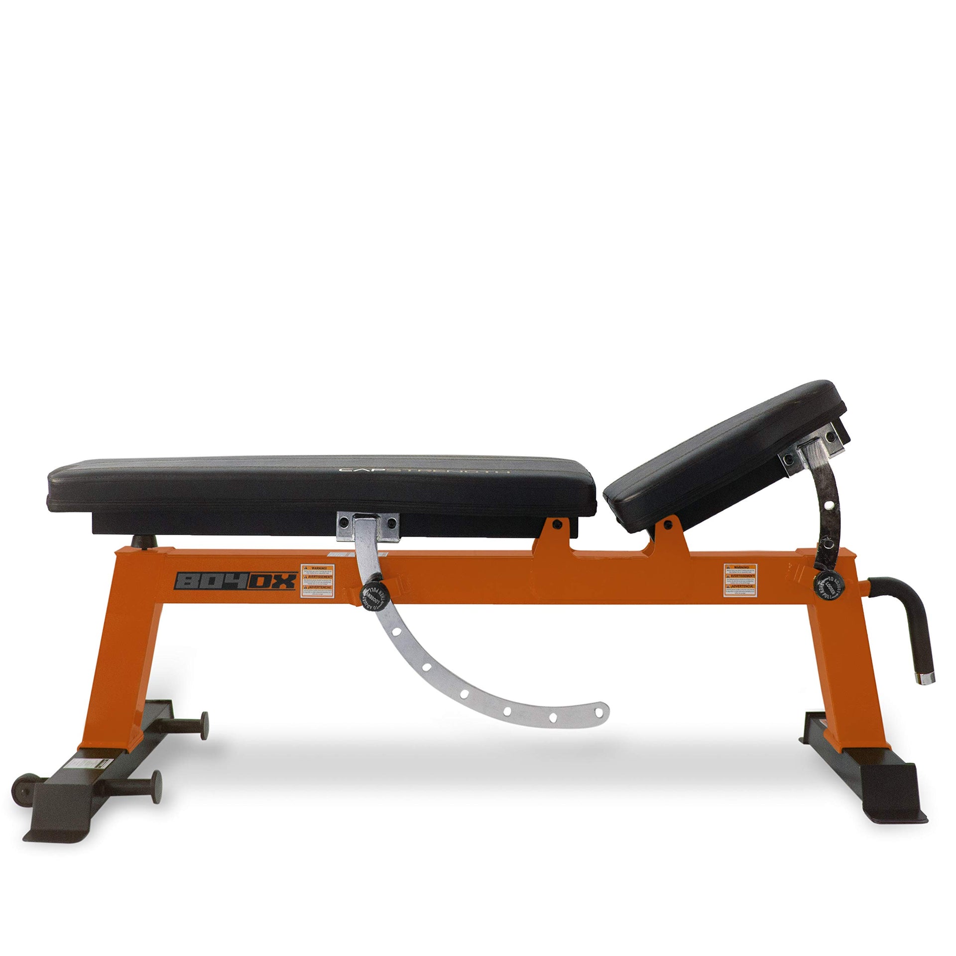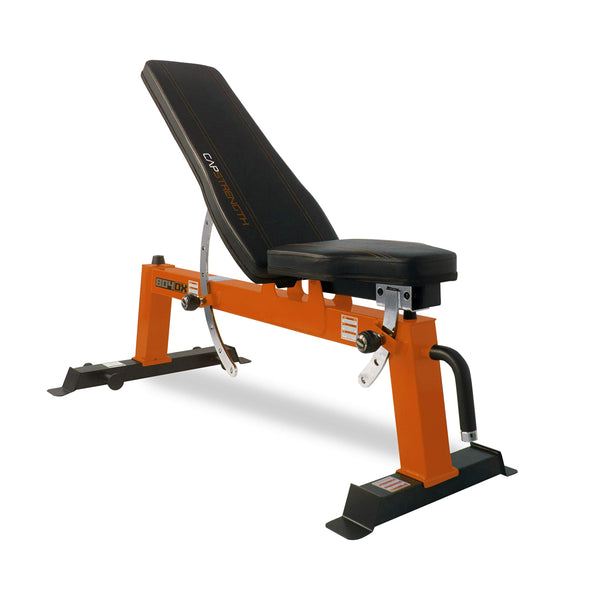 The CAP Deluxe Utility Bench in orange incorporates all of the necessary features and functions found on traditional weightlifting utility benches and incorporates additional features to take advantage of other training methods. The band/tube posts, an industry first feature, allows the CAP Deluxe Utility Weight Bench to be used with resistance tubes or bands to incorporate low impact resistance exercise alternatives to your exercise program (great for rehabbing and senior strength building). Use this bench as a key component in dumbbell training routines. Perform a number of upper and lower body exercises while incorporating dumbbell use to hit goals and build/maintain muscle. This bench can also be used as the center piece for core exercises. Great for leg lifts, crunches, twists and more. Add the CAP Barbell FM-905Q Color Series Exercise Rack or FM-8000F Color Series Deluxe Power Rack to color coordinate and customize your home gym (not included). Recommended maximum weight capacities for the bench are 500 lb (flat position, including user) and 400 lb (inclined positions, including user). The unit is for indoor use only.
