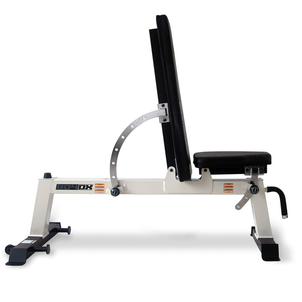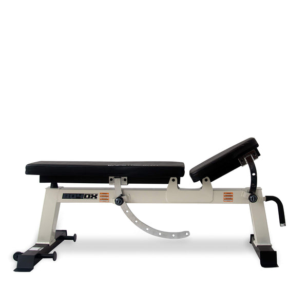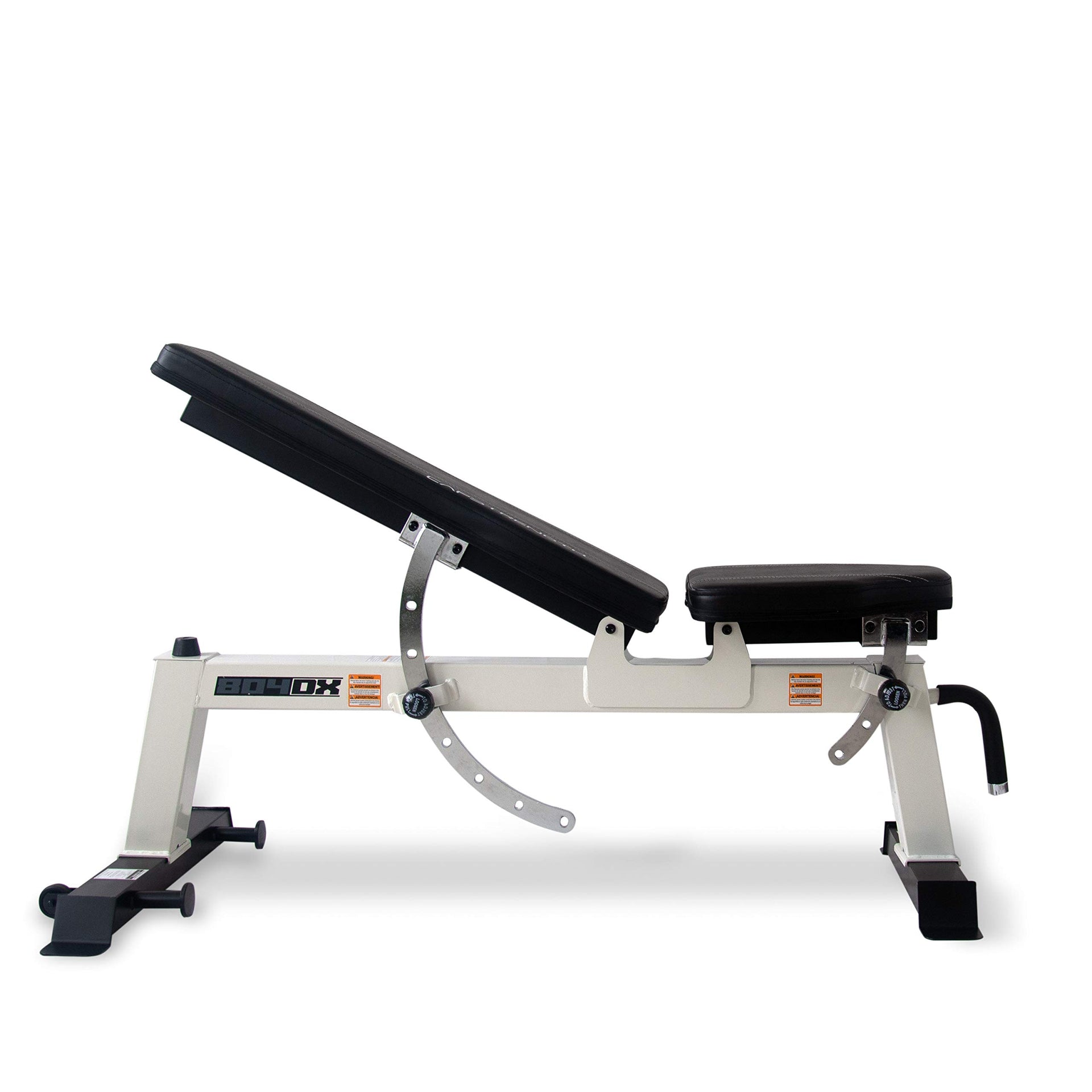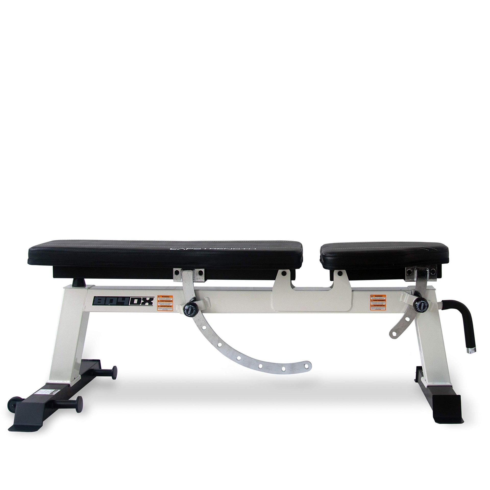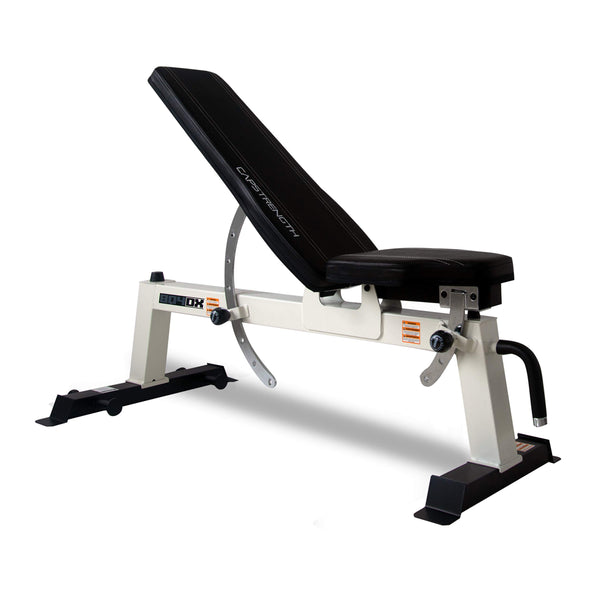 The CAP Deluxe Utility Bench in white incorporates all of the necessary features and functions found on traditional weightlifting utility benches and incorporates additional features to take advantage of other training methods. The band/tube posts, an industry first feature, allows the CAP Deluxe Utility Weight Bench to be used with resistance tubes or bands to incorporate low impact resistance exercise alternatives to your exercise program (great for rehabbing and senior strength building). Use this bench as a key component in dumbbell training routines. Perform a number of upper and lower body exercises while incorporating dumbbell use to hit goals and build / maintain muscle. This bench can also be used as the center piece for core exercises. Great for leg lifts, crunches, twists and more. Add the CAP Barbell FM-905Q Color Series Exercise Rack or FM-8000F Color Series Deluxe Power Rack to color coordinate and customize your home gym (not included). Recommended maximum weight capacities for the bench are 500 lb (flat position, including user) and 400 lb (inclined positions, including user). The unit is for indoor use only.