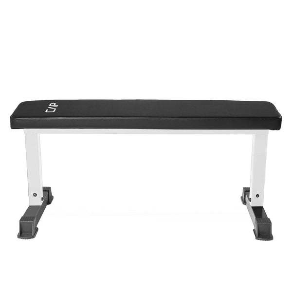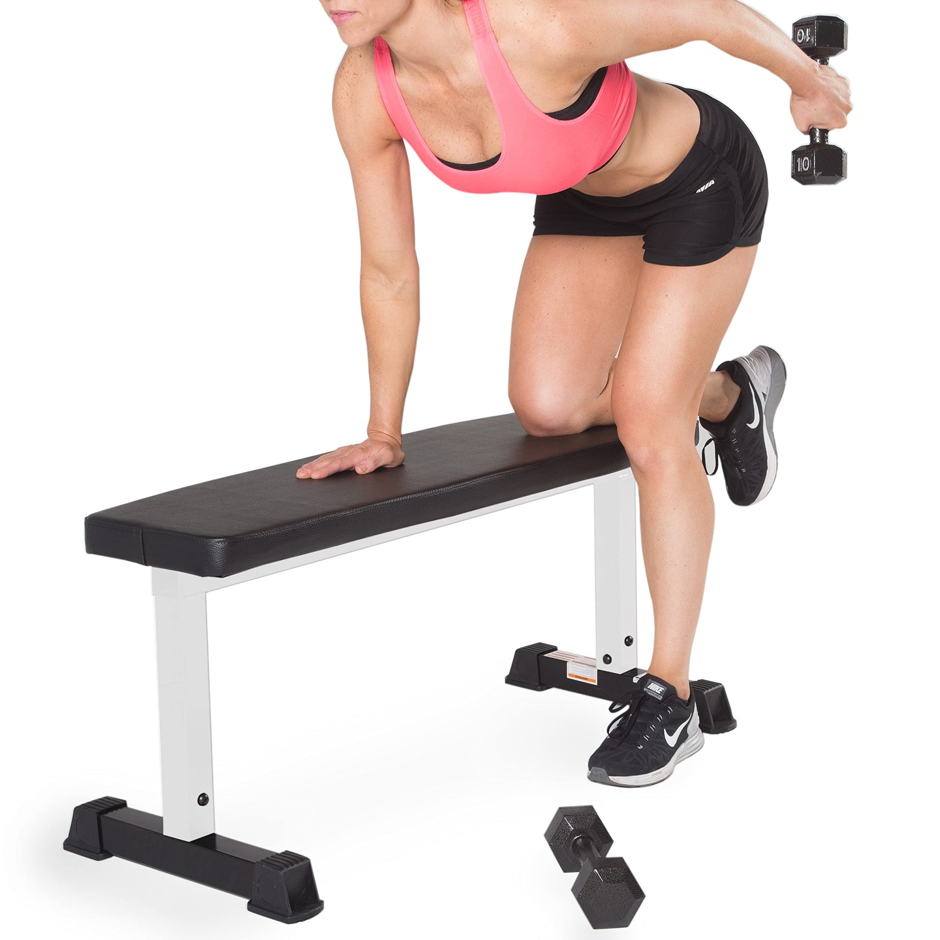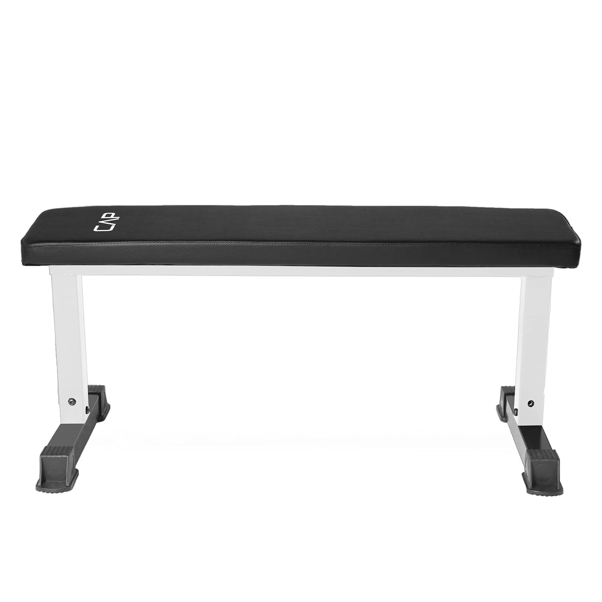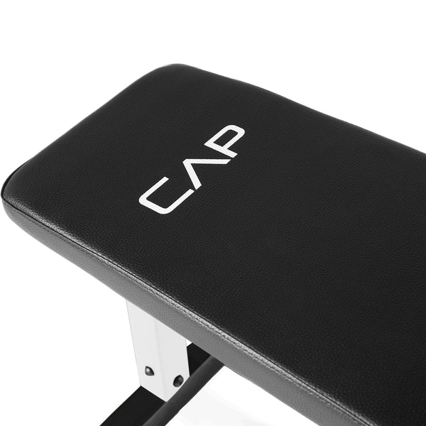 Customize and outfit your home gym with CAPs Color Series Flat Weight Benches The CAP Flat Weight Bench in WHITE is a safe, simple and effective tool for nearly any exercise routine. Utilize the versatility of the CAP Flat Weight Bench by incorporating this bench into your dumbbell exercises, tube or band exercises, ab workouts, and body weight exercises. Built tough, this weight bench features a powder-coated steel frame with a thick, comfortable padded surface to add strength, durability and comfort to all your workout routines This bench is quick and easy to assemble and is an essential piece of fitness equipment for any home gym. Assembled dimensions are 42.5 L x 18 w x 19 H. Includes 30-day manufacturer warranty.