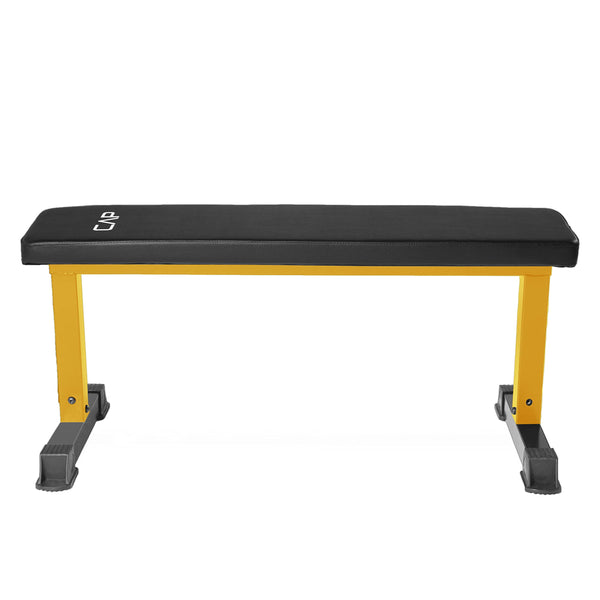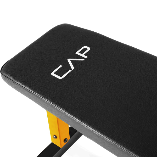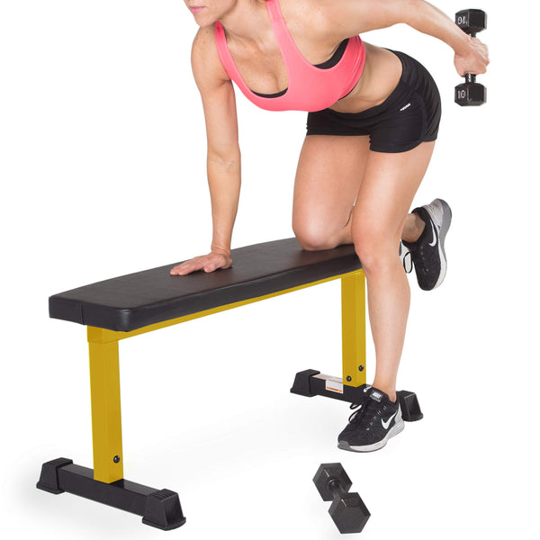 Customize and outfit your home gym with CAPs Color Series Flat Weight Benches! The CAP Flat Weight Bench in YELLOW is a safe, simple and effective tool for nearly any exercise routine. Utilize the versatility of the CAP Flat Weight Bench by incorporating this bench into your dumbbell exercises, tube or band exercises, ab workouts, and body weight exercises. Built tough, this weight bench features a powder-coated steel frame with a thick, comfortable padded surface to add strength, durability and comfort to all your workout routines! This bench is quick and easy to assemble and is an essential piece of fitness equipment for any home gym. Assembled dimensions are 42.5'' L x 18Inches w x 19'' H. Includes 30-day manufacturer warranty.