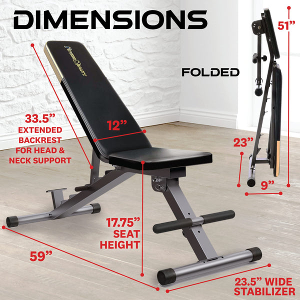 Get in shape and see results with the Fitness Reality 1000 Super Max Weight Bench. The ab bench is constructed from solid tubular steel and can support up to 800 pounds. It features a 12-position backrest utilizing a 2-position front leg adjustment. The heavy-duty folding bench independently adjusts to a -20 degree decline to +80 degree incline angles and a flat position height of 17.5''. Our exercise equipment weight bench will enhance your upper and lower body workouts and is perfect for dumbbells and multiple strength training exercises. Our portable workout bench is easy to fold up and store anywhere.