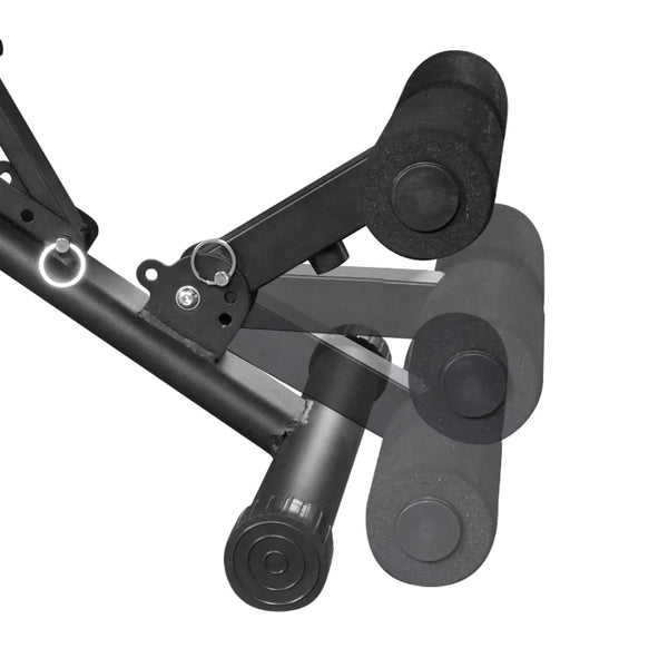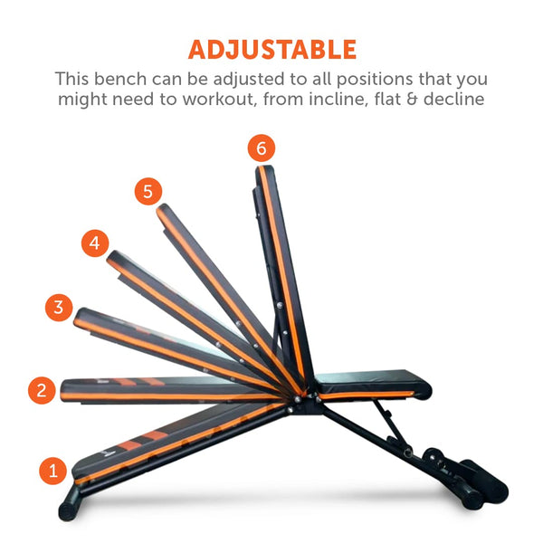 FOLDABLE EXERCISE BENCH Can be folded flat & half the size of the actual bench, great storage space savor bench, also makes it easier to move it around Supports Up To 550 LBS Great for home and commercial useADJUSTABLE: This exercise bench can be adjusted just use the pins to adjust the back and legs back of the bench to adjust your positionPOSITIONS: The back of the bench can be used in 6 positions and the legs can be adjusted to 3 different positions SEAT: The seat can be adjusted to 3 different positions, so when you make sit up or decline bench press, you can pick up the seat so it will be even with the back support