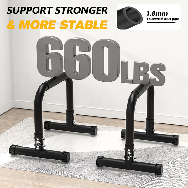 Pay Attention: The Push Up Bar fits for the 660lbs,please don't worry about that. RELIFE REBUILD YOUR LIFE. Rebuild your confidence and attitude towards life. Bring a healthy energetic lifestyle for you. Only in health can life be more exacting Product Features Easy Installation: With instructions and tool. Just taking a few minutes to install Quality Assurance: Durable lightweight steel with safety connector to ensure stability Space Saving: The product is easy storage, you can put it in the corner when you not use Burn Fat and Calories: Total body workout. When you keep a good health, you can own a perfect body at the same time Product Specifications Weight: 10.25LBS Product Size: 17.13 x 11.8x 14.17in.